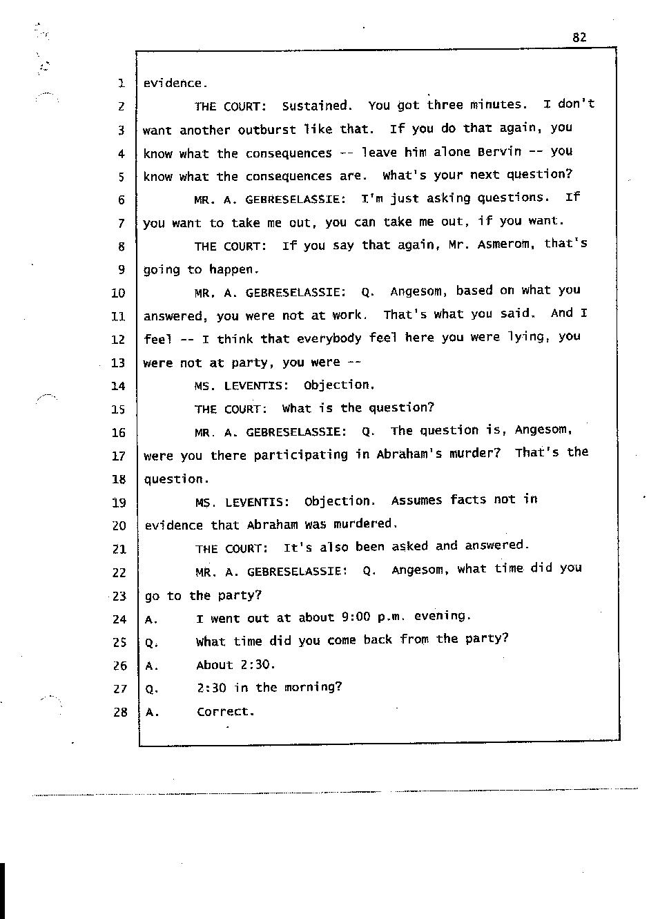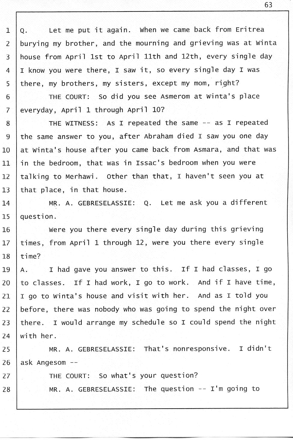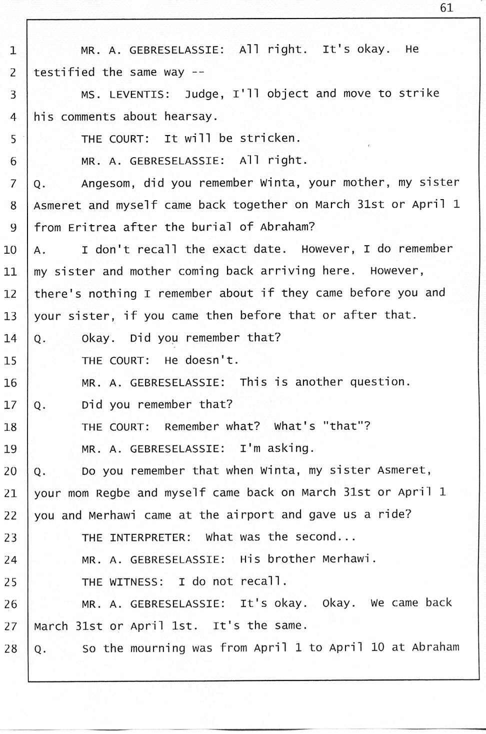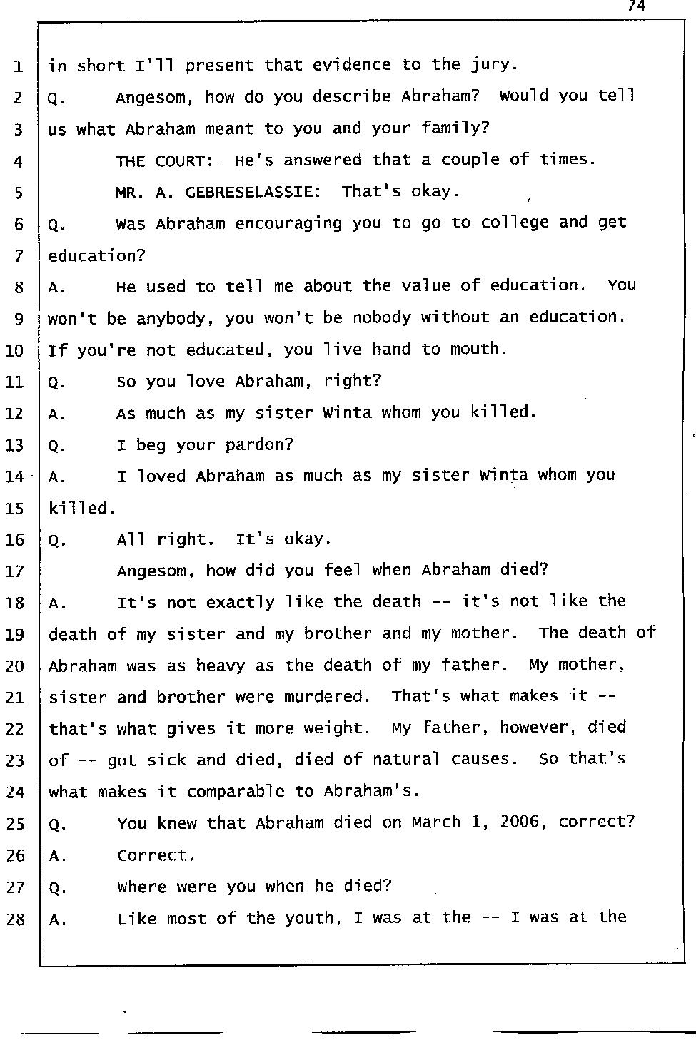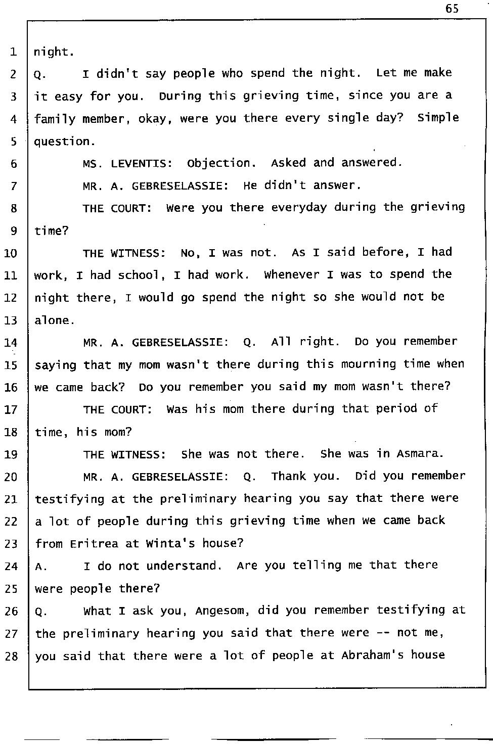 Angesom’s testimony clearly tells you that he was not where he claimed he was at the time of Abraham’s death. Clearly there are numerous holes in the prosecutor’s account about Angesom’s where abouts at the time of Abraham’s death. But why falsify testimony if Angesom has nothing to hide; if he is not guilty of something?
