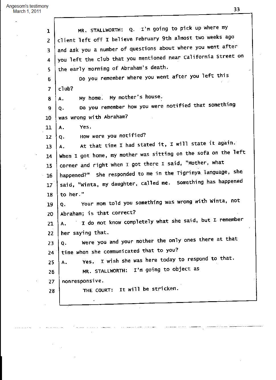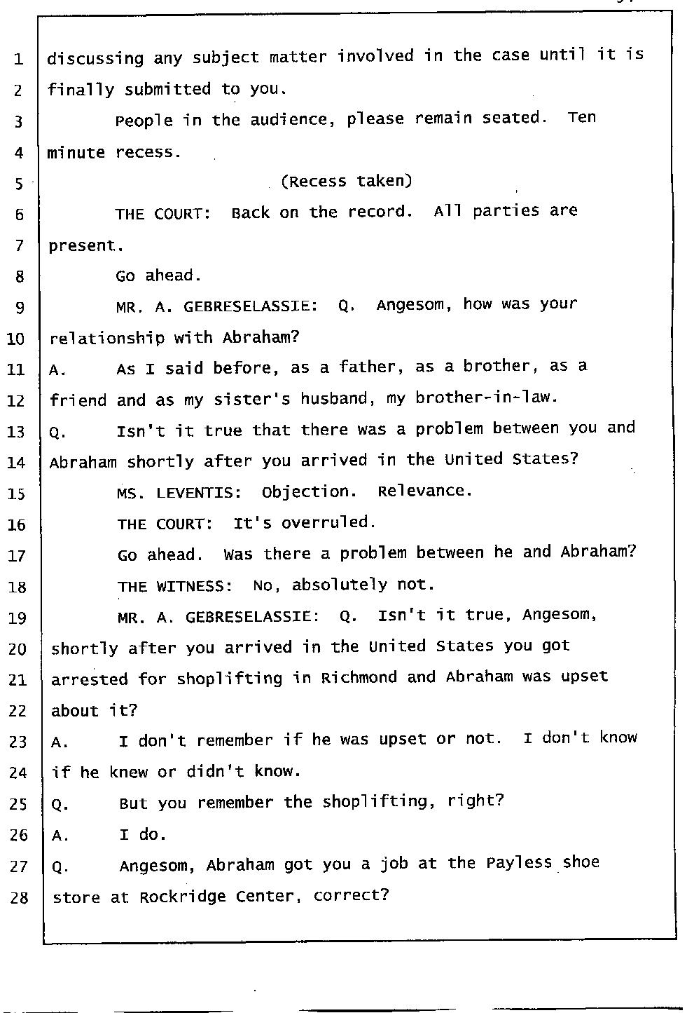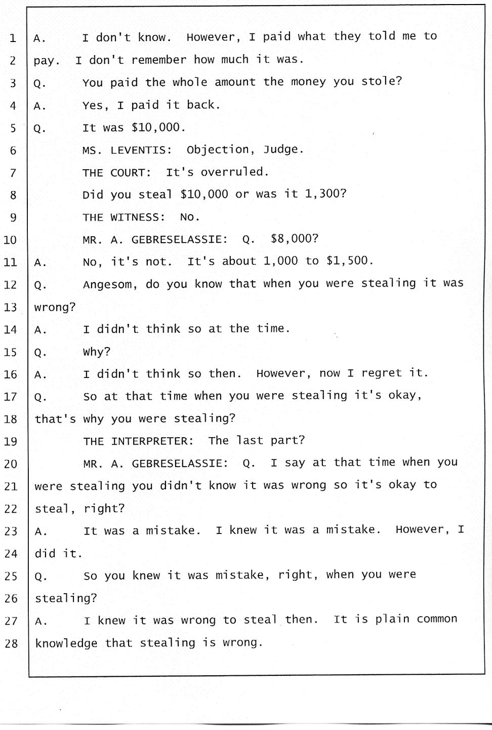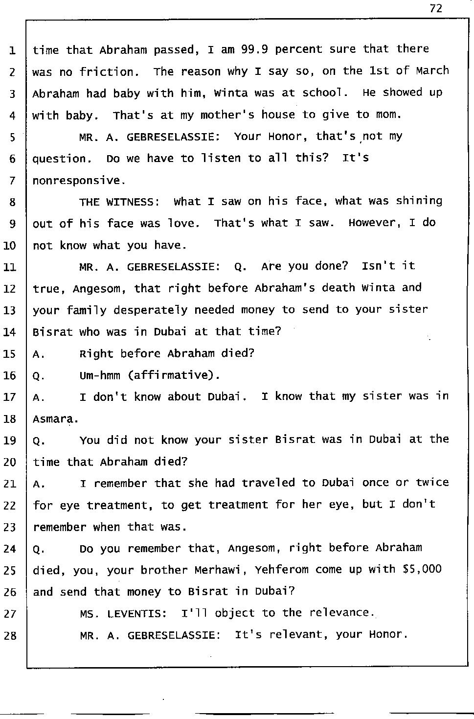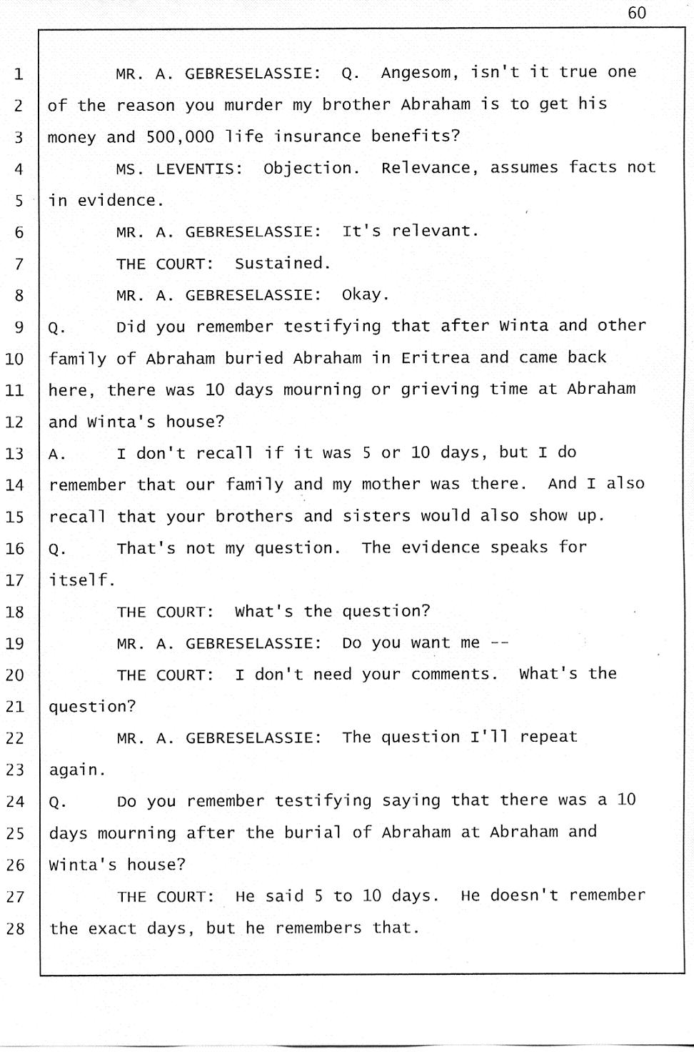 Angesom’s testimony clearly tells you that he was not where he claimed he was at the time of Abraham’s death. Clearly there are numerous holes in the prosecutor’s account about Angesom’s where abouts at the time of Abraham’s death. But why falsify testimony if Angesom has nothing to hide; if he is not guilty of something?