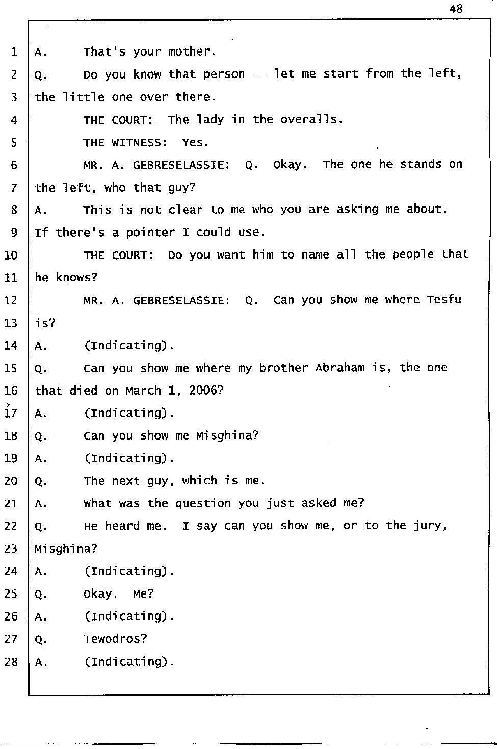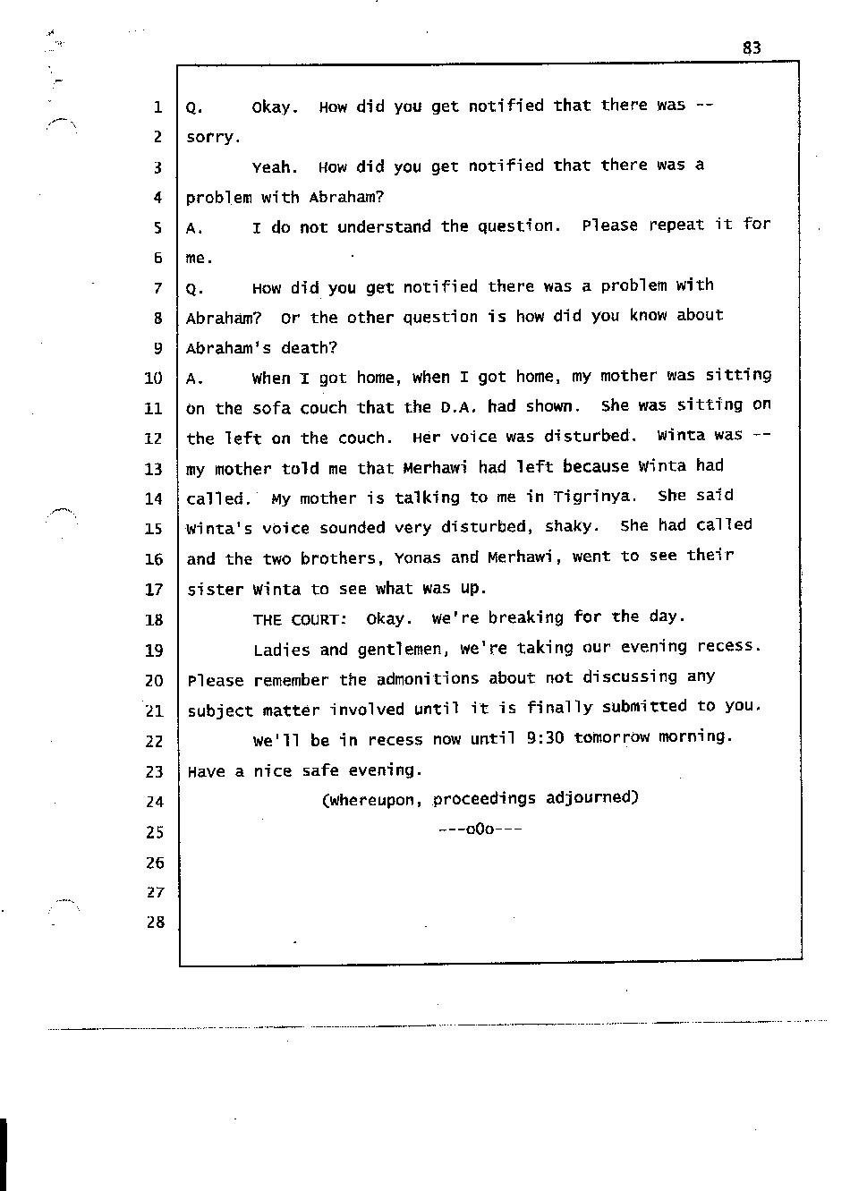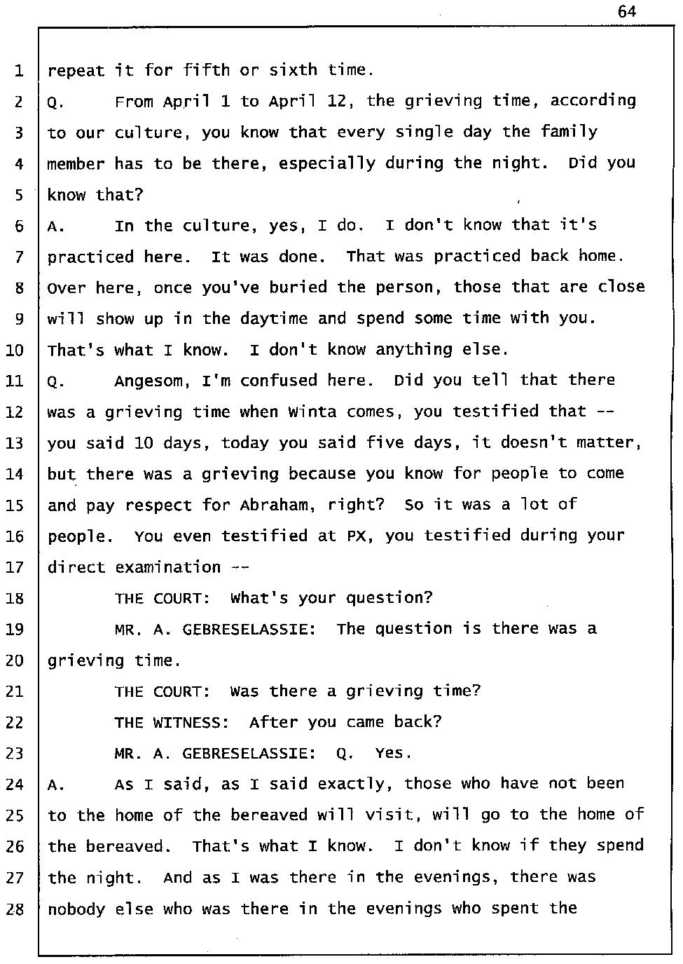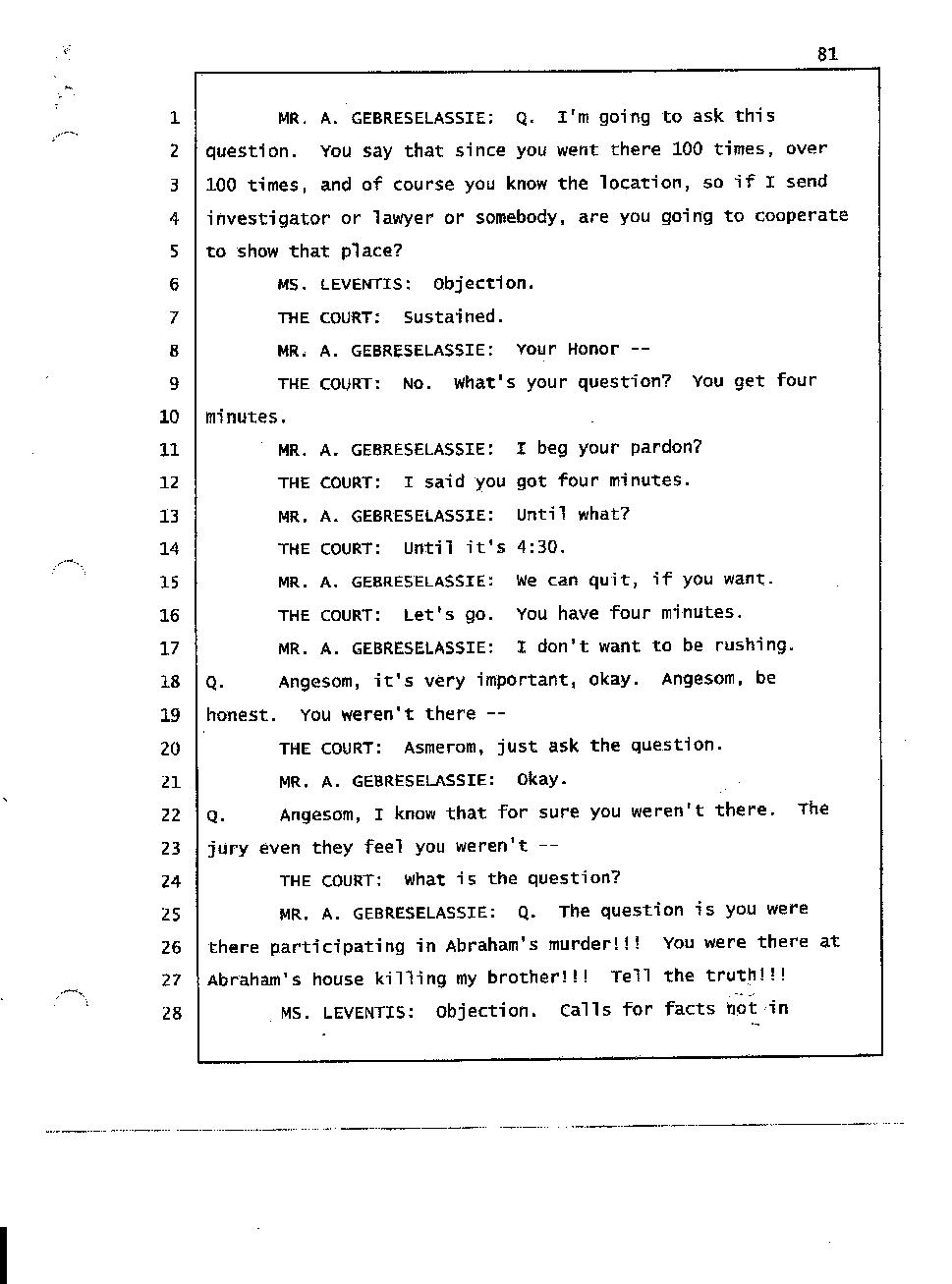 Angesom’s testimony clearly tells you that he was not where he claimed he was at the time of Abraham’s death. Clearly there are numerous holes in the prosecutor’s account about Angesom’s where abouts at the time of Abraham’s death. But why falsify testimony if Angesom has nothing to hide; if he is not guilty of something?