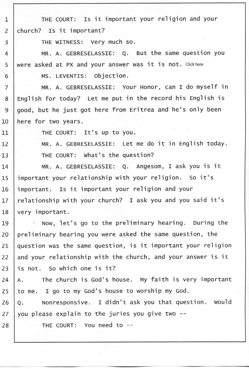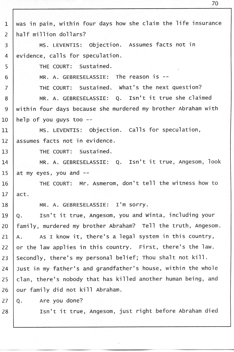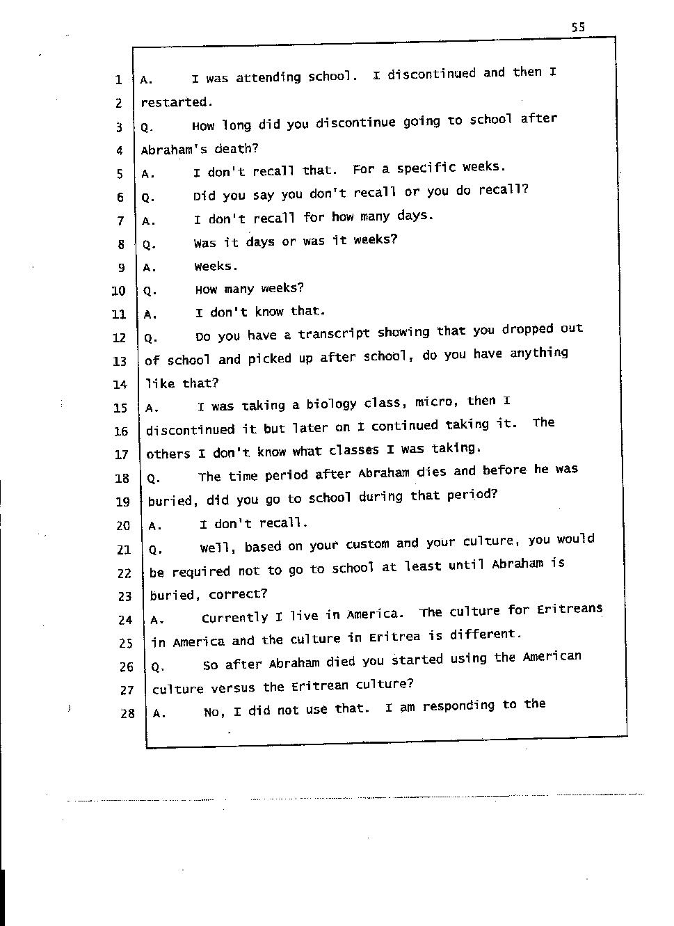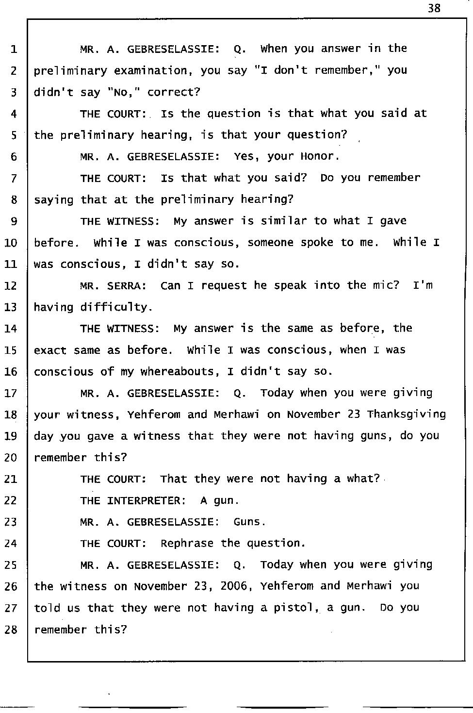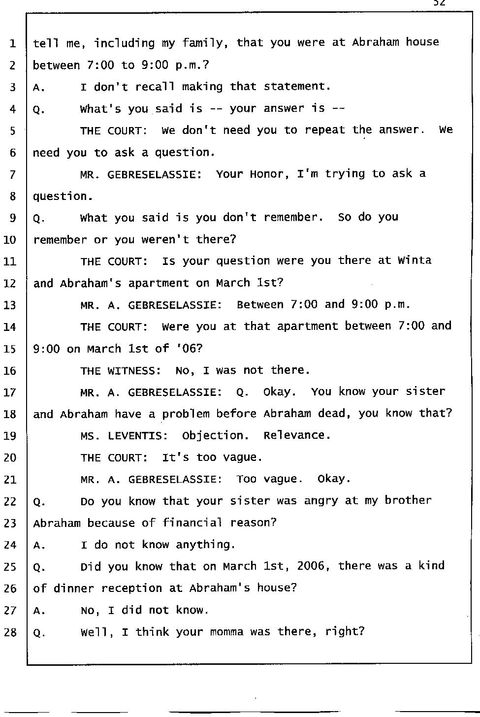 Angesom’s testimony clearly tells you that he was not where he claimed he was at the time of Abraham’s death. Clearly there are numerous holes in the prosecutor’s account about Angesom’s where abouts at the time of Abraham’s death. But why falsify testimony if Angesom has nothing to hide; if he is not guilty of something?