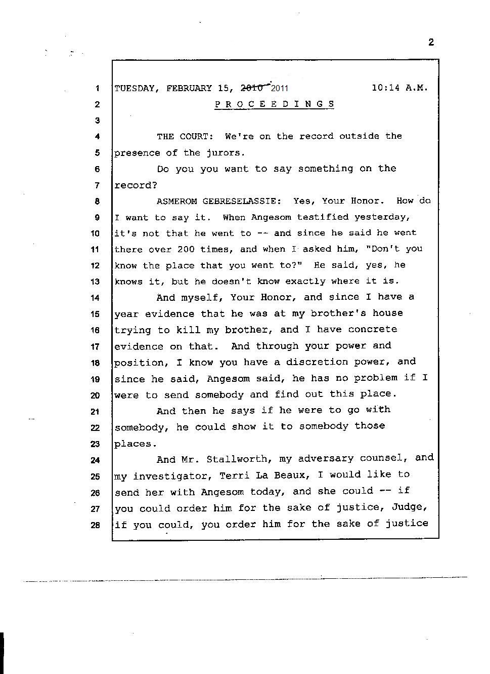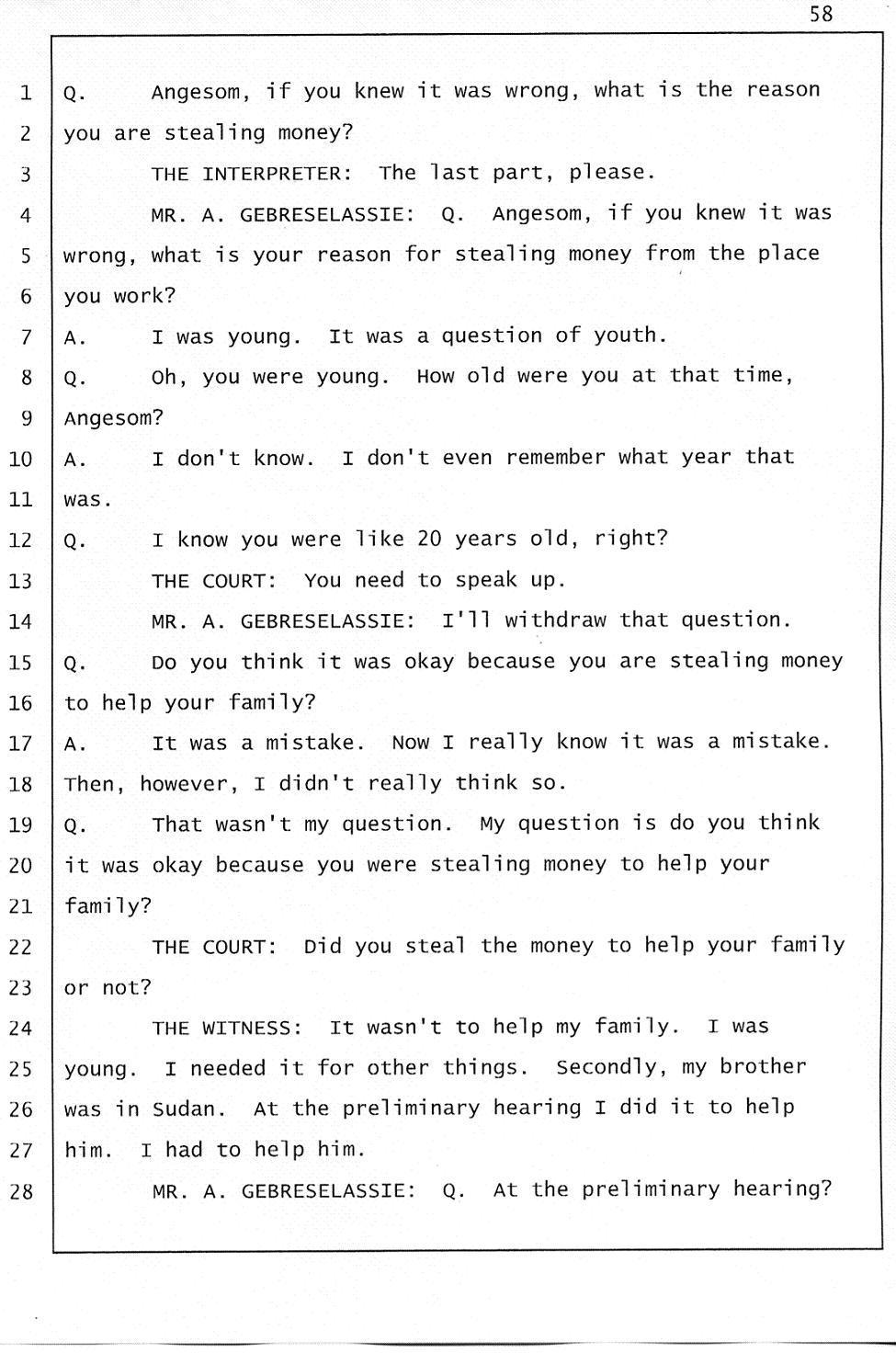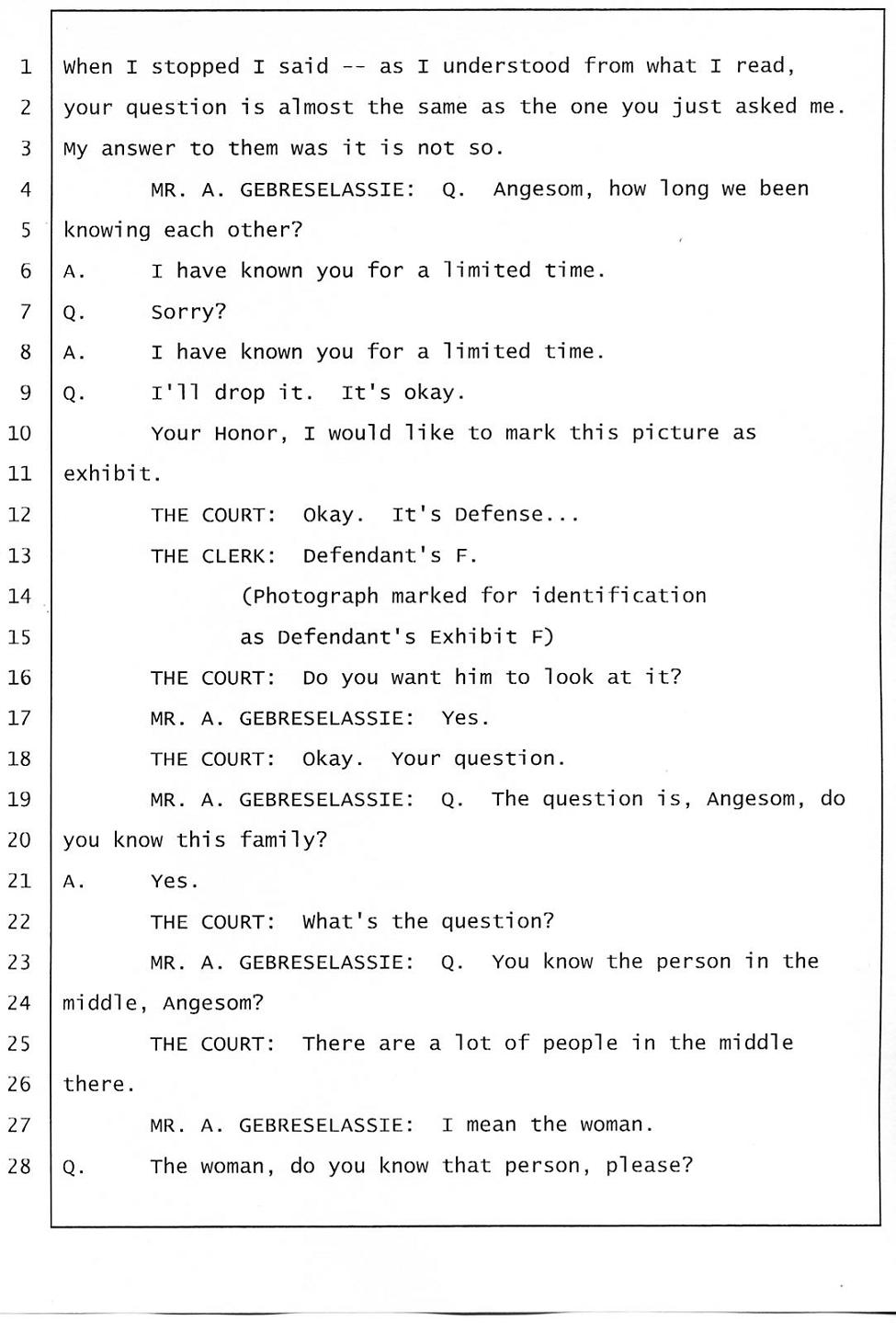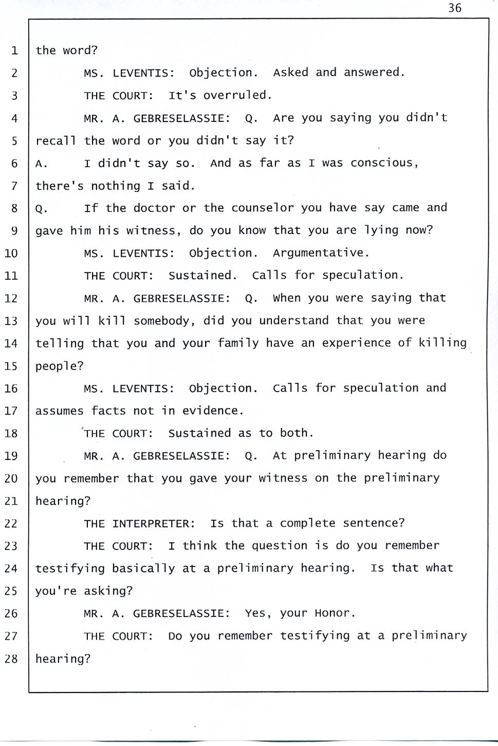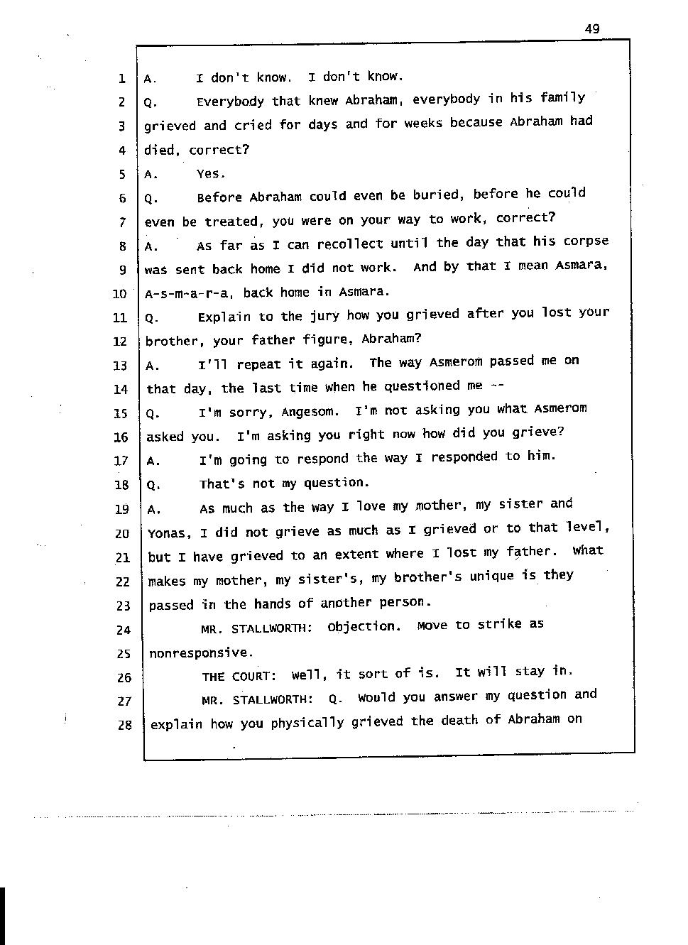 Angesom’s testimony clearly tells you that he was not where he claimed he was at the time of Abraham’s death. Clearly there are numerous holes in the prosecutor’s account about Angesom’s where abouts at the time of Abraham’s death. But why falsify testimony if Angesom has nothing to hide; if he is not guilty of something?