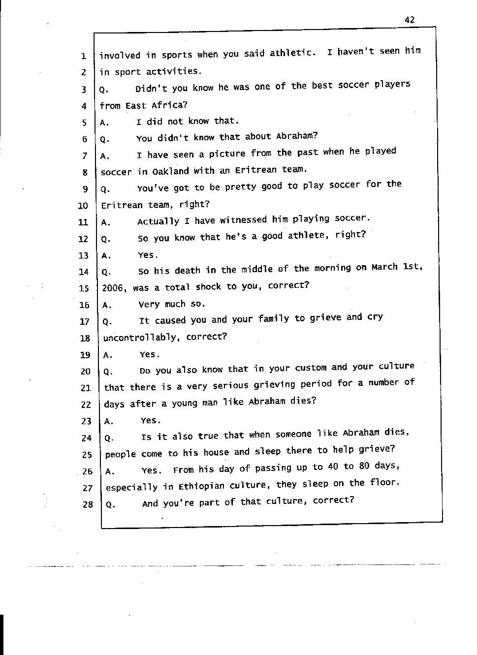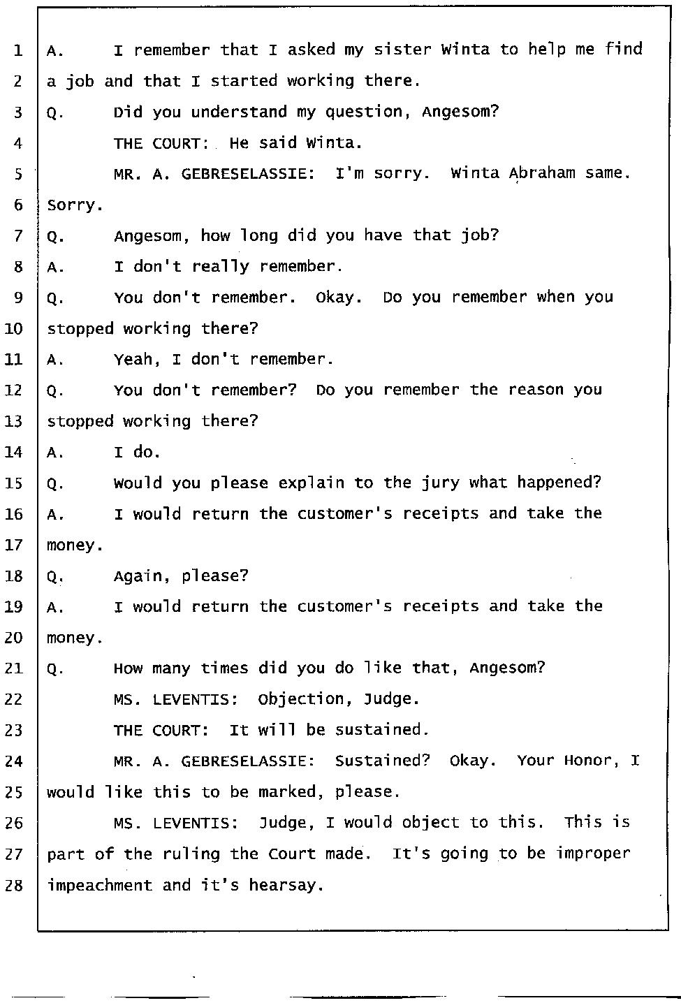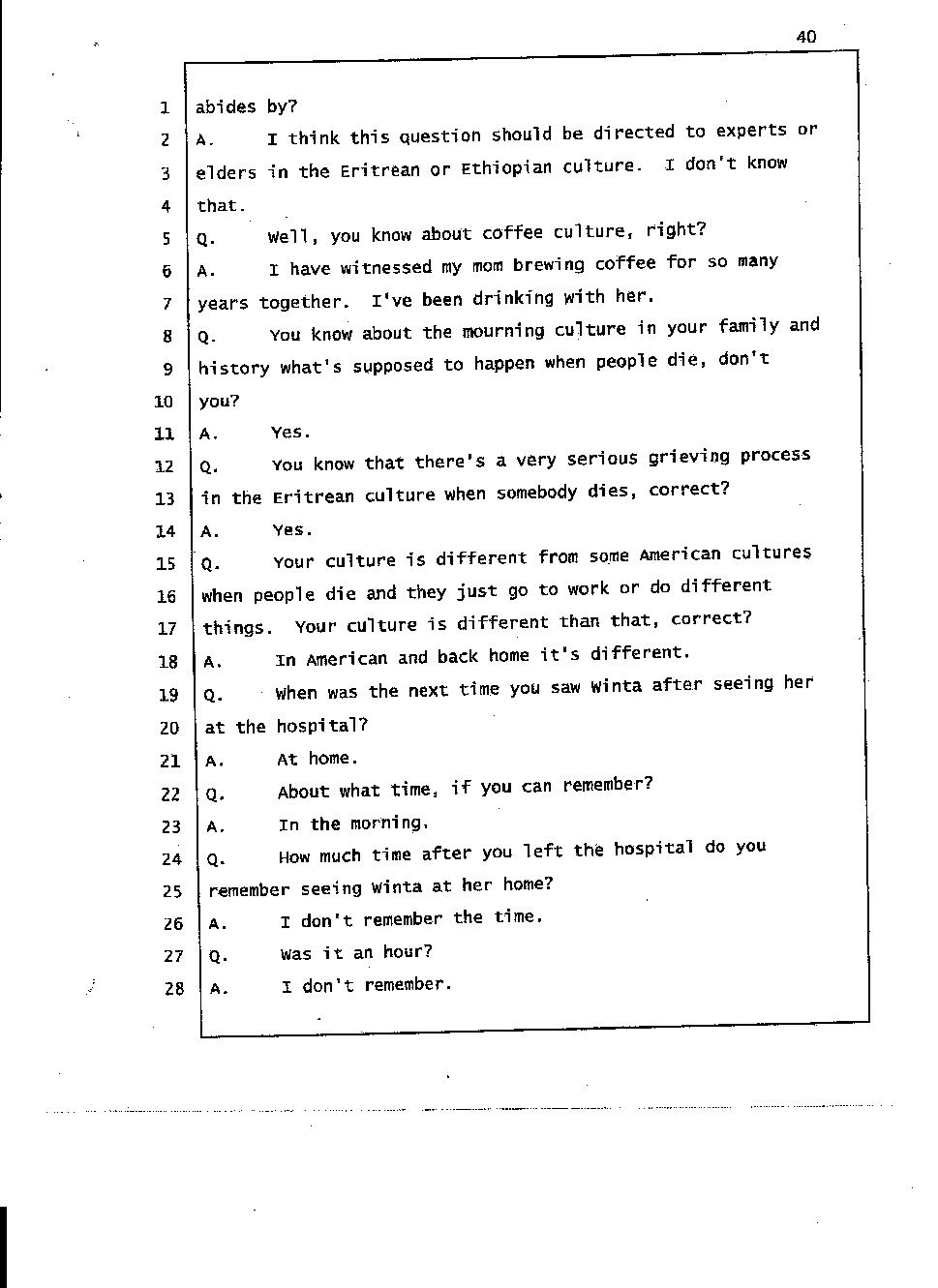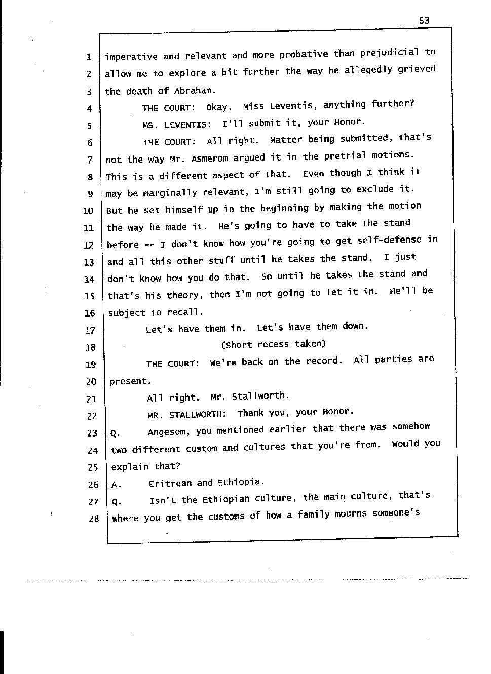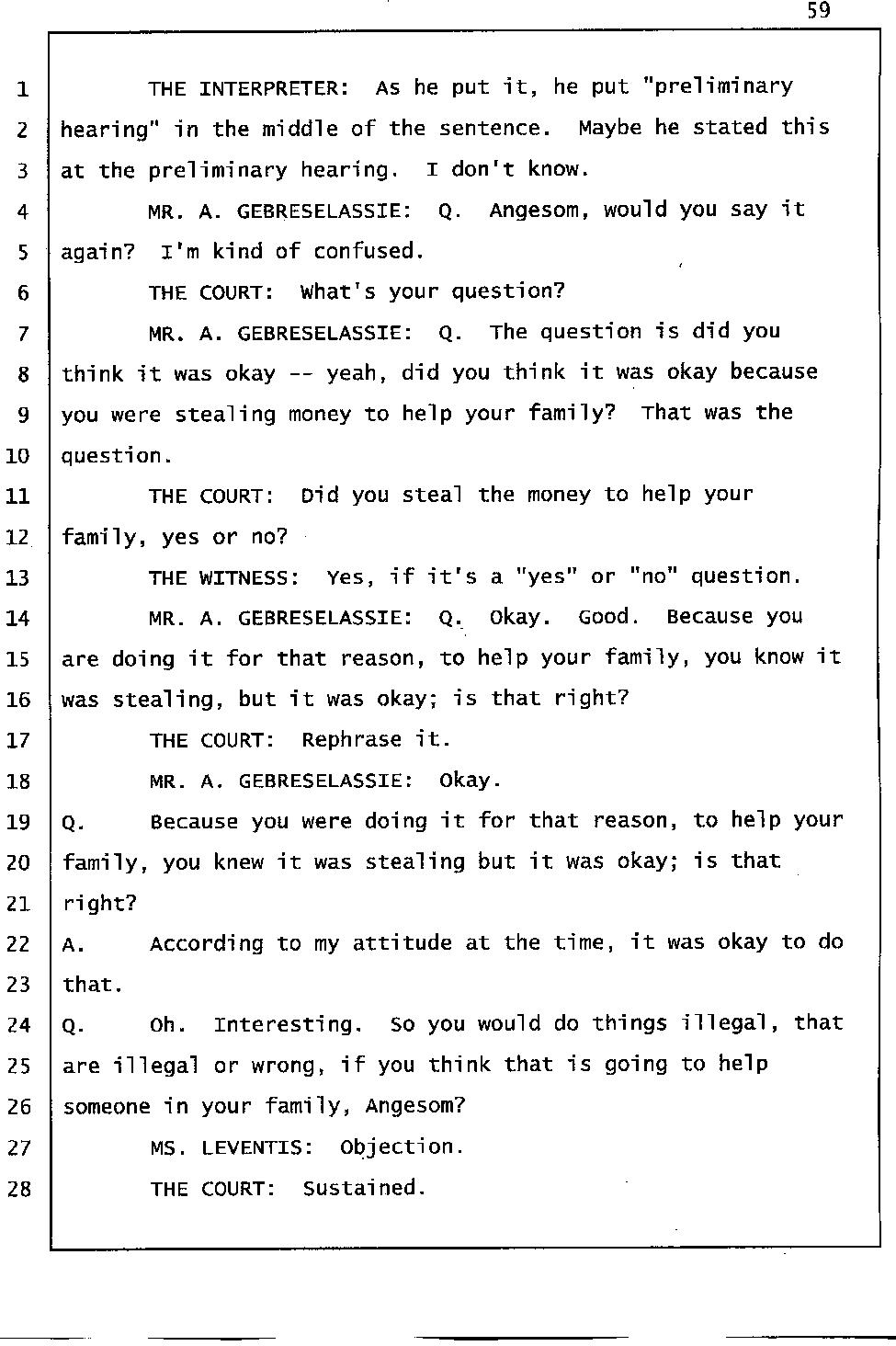 Angesom’s testimony clearly tells you that he was not where he claimed he was at the time of Abraham’s death. Clearly there are numerous holes in the prosecutor’s account about Angesom’s where abouts at the time of Abraham’s death. But why falsify testimony if Angesom has nothing to hide; if he is not guilty of something?