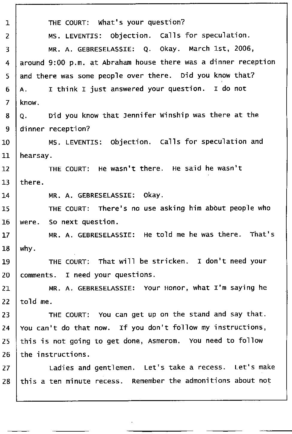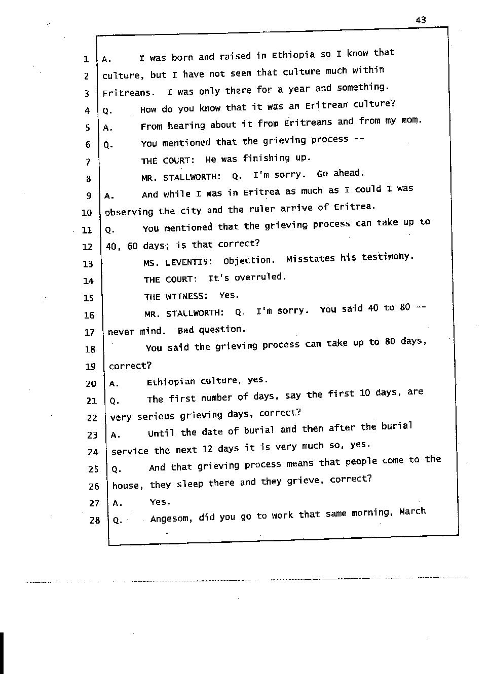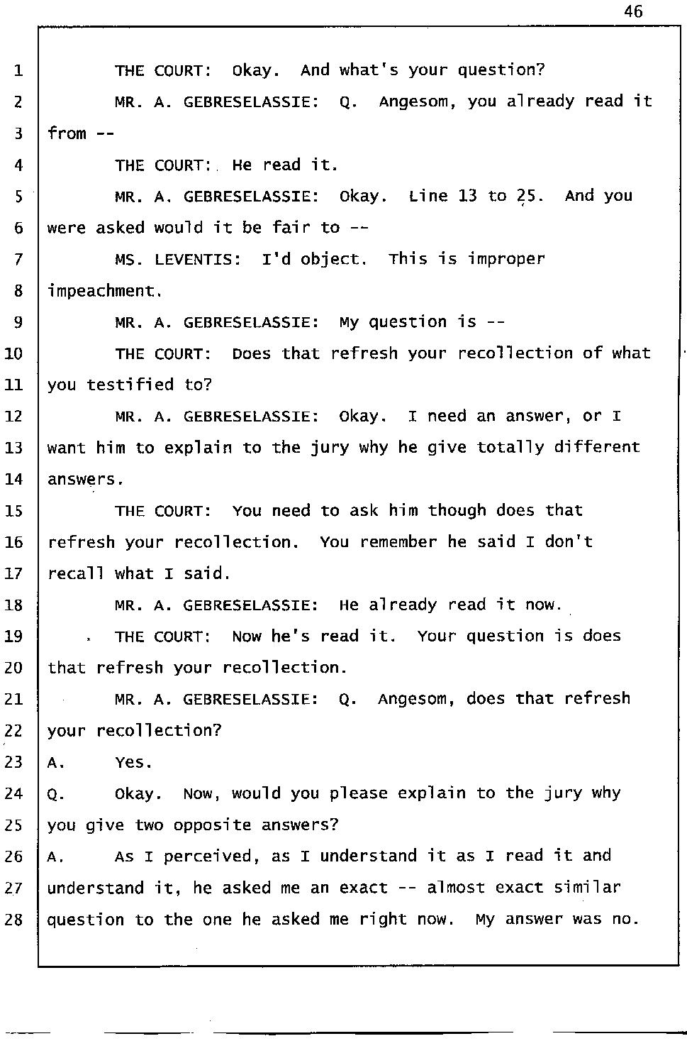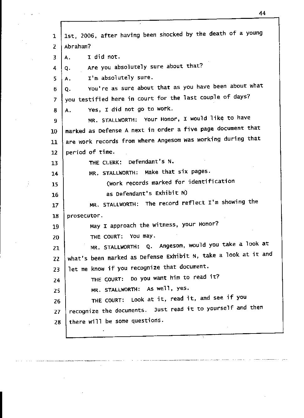 Angesom’s testimony clearly tells you that he was not where he claimed he was at the time of Abraham’s death. Clearly there are numerous holes in the prosecutor’s account about Angesom’s where abouts at the time of Abraham’s death. But why falsify testimony if Angesom has nothing to hide; if he is not guilty of something?