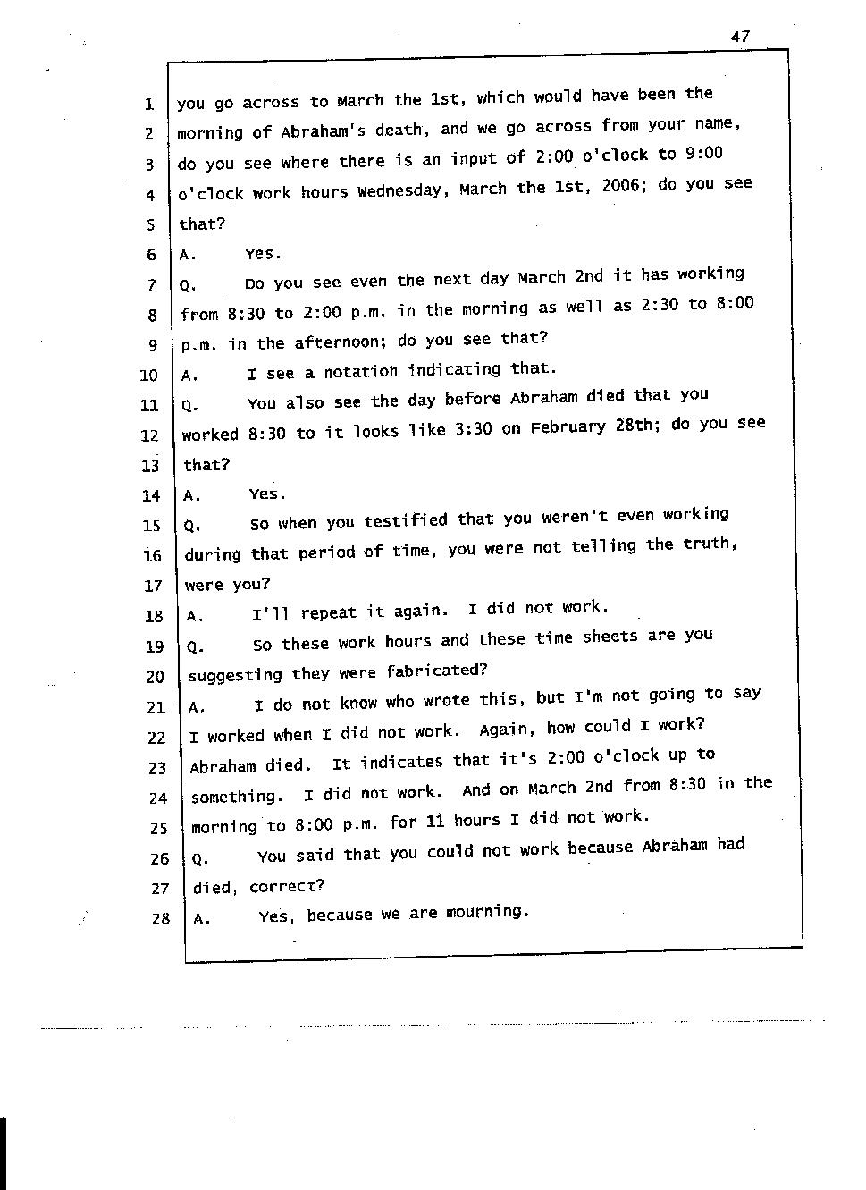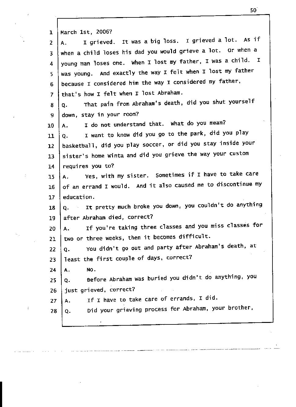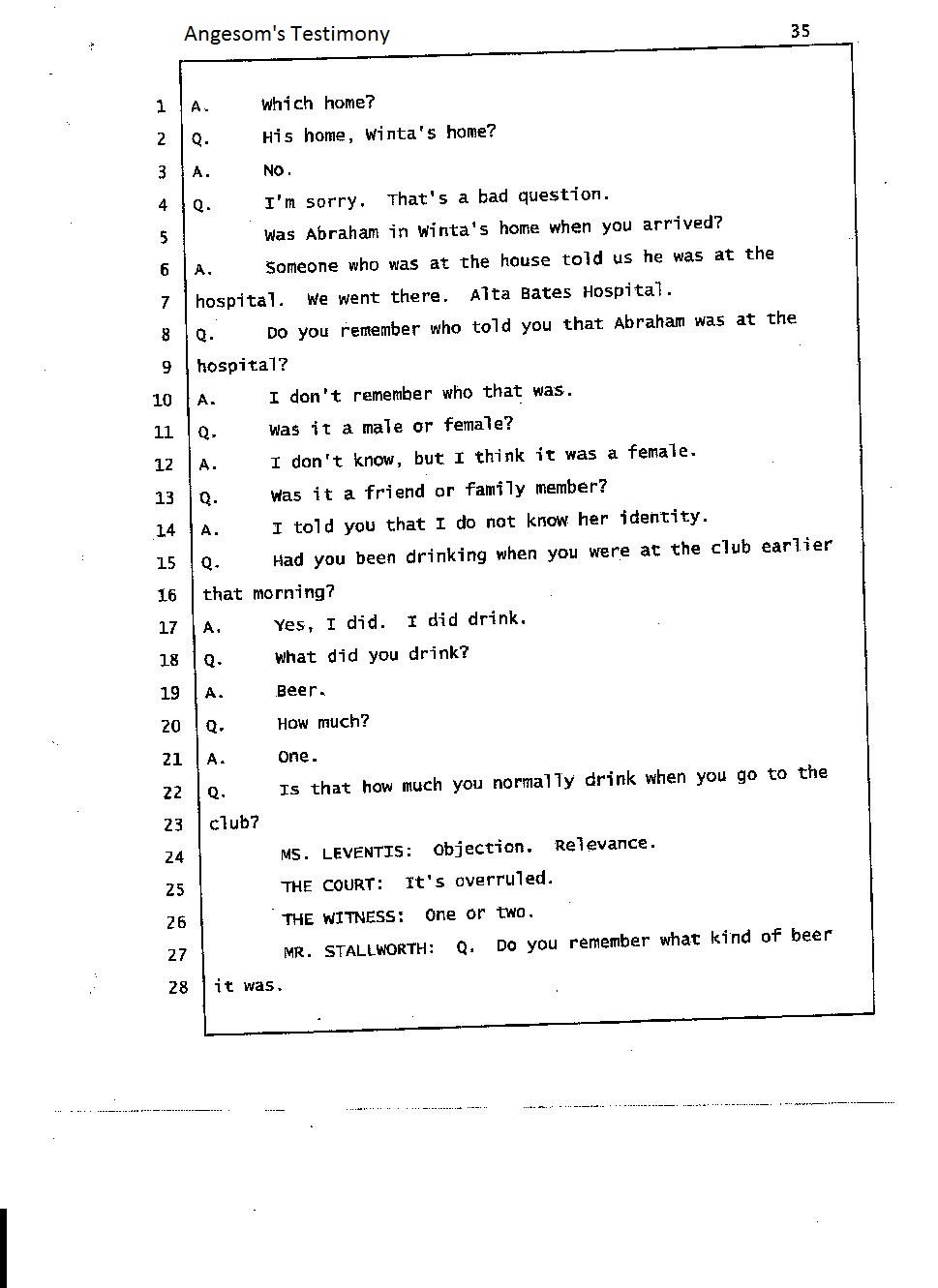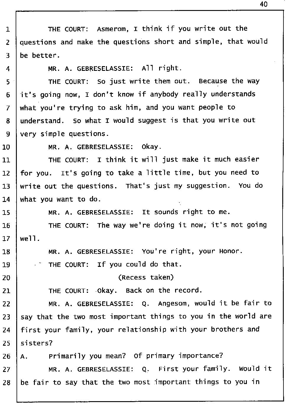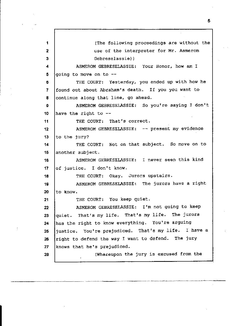 Angesom’s testimony clearly tells you that he was not where he claimed he was at the time of Abraham’s death. Clearly there are numerous holes in the prosecutor’s account about Angesom’s where abouts at the time of Abraham’s death. But why falsify testimony if Angesom has nothing to hide; if he is not guilty of something?