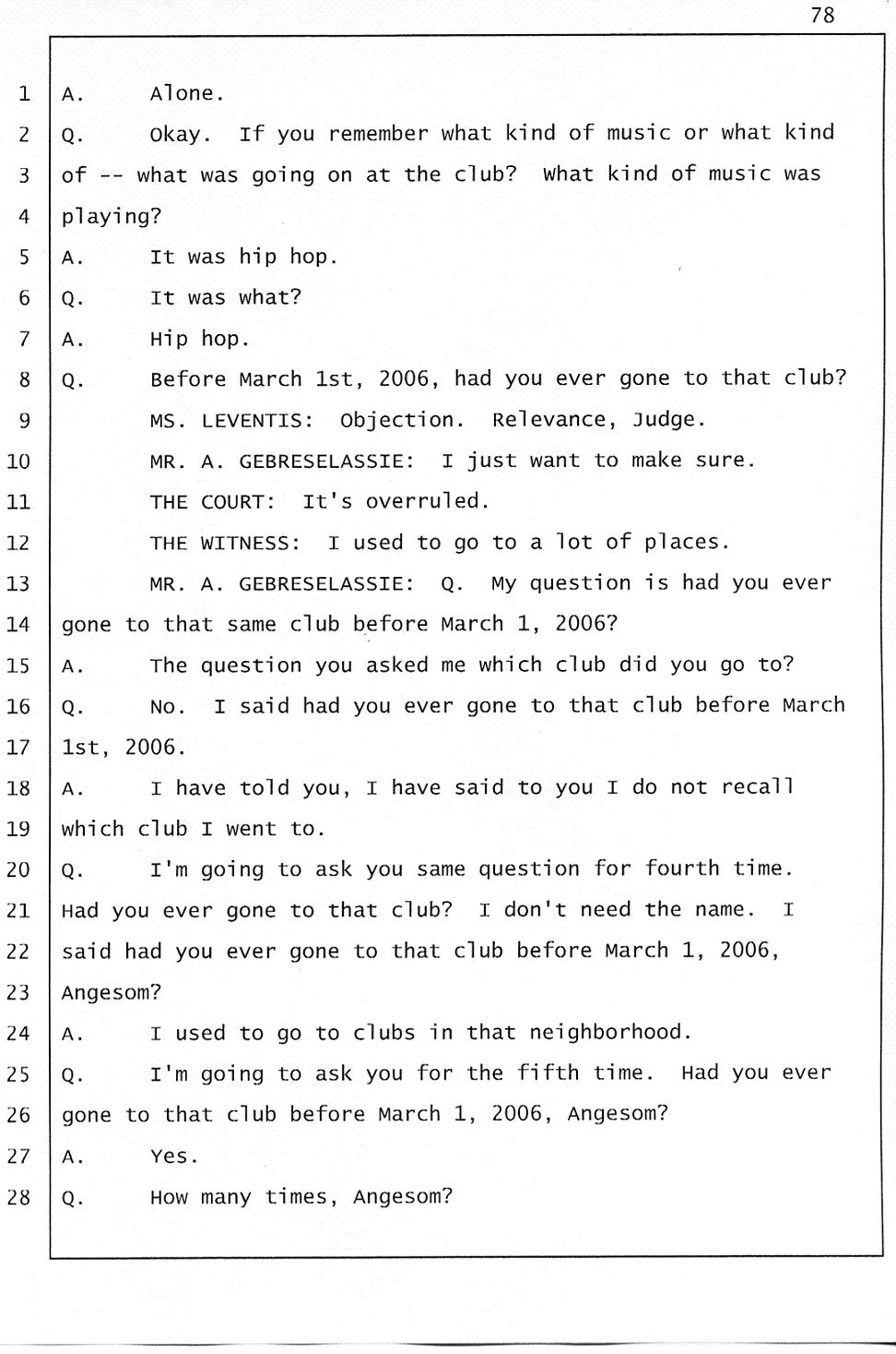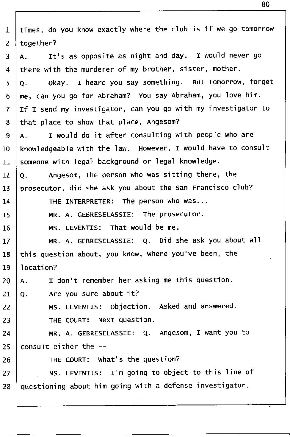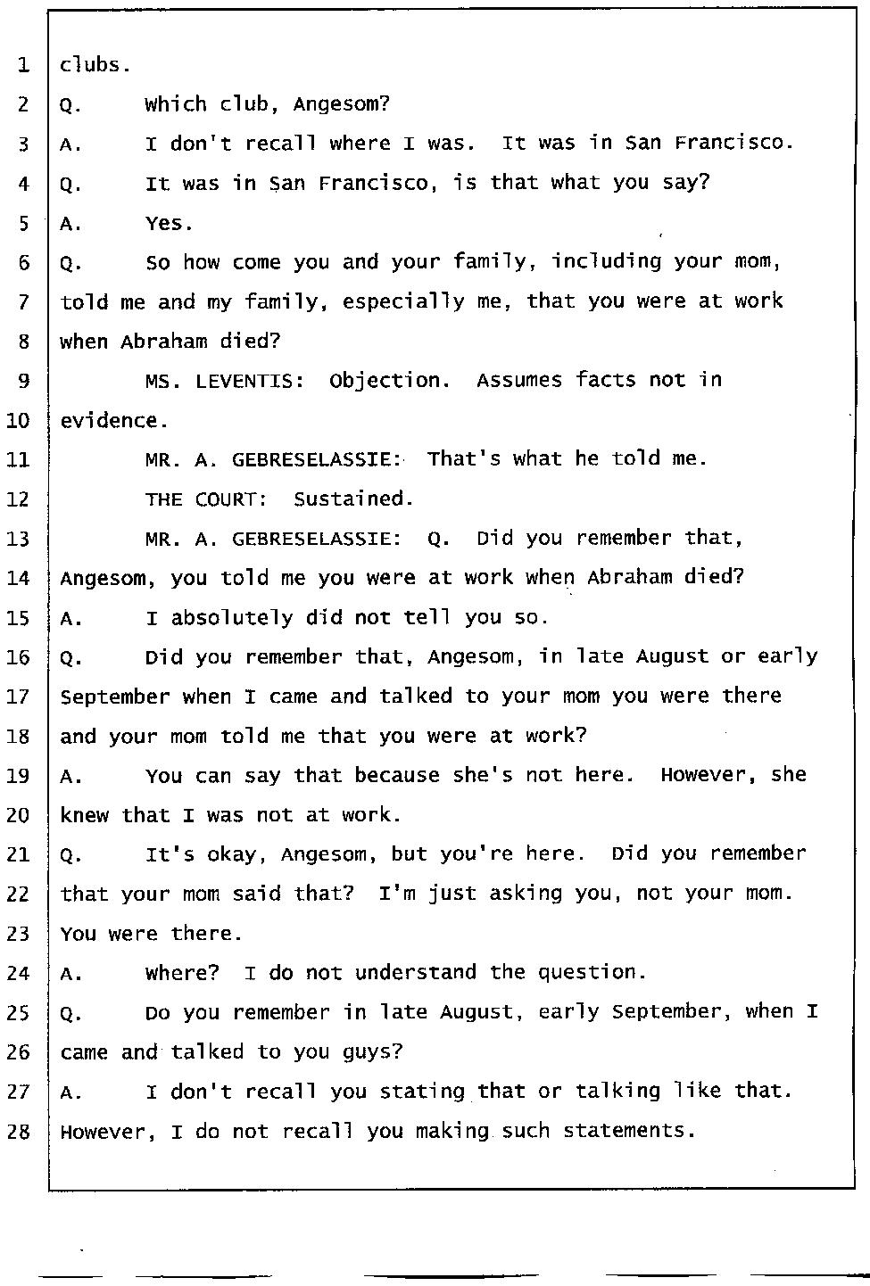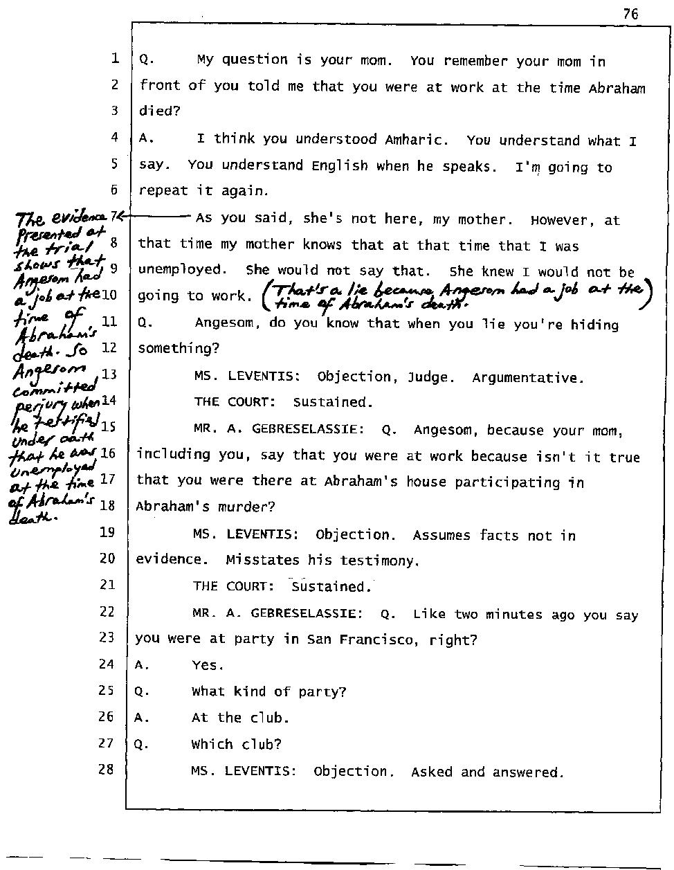 Initially Angesom and his family claimed Angesom was at work in the early morning of March 1, 2006 to cover up the fact that he was at Abraham’s house participating in Abraham’s murder. During the preliminary hearing, however, Angesom changed his story and he deliberately lied on the witness stand while he was under oath, saying that he was at a bar in San Francisco at the time of Abraham’s death. He changed his account because he knew investigators would find out that he was not at work. During the trial, he came up with a different story and he deliberately testified falsely under oath that he was at a club that played hip-hop music, drinking beer and partying there. Furthermore, he testified that he had been to that particular club over 100 times in the past. He said the club was located on California street around the Immigration office. Click here.