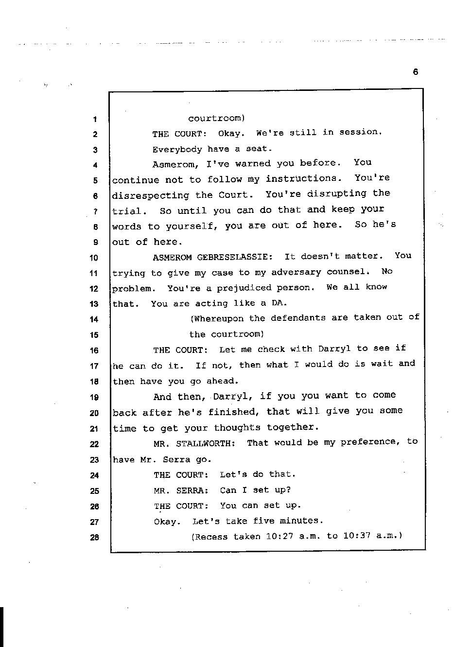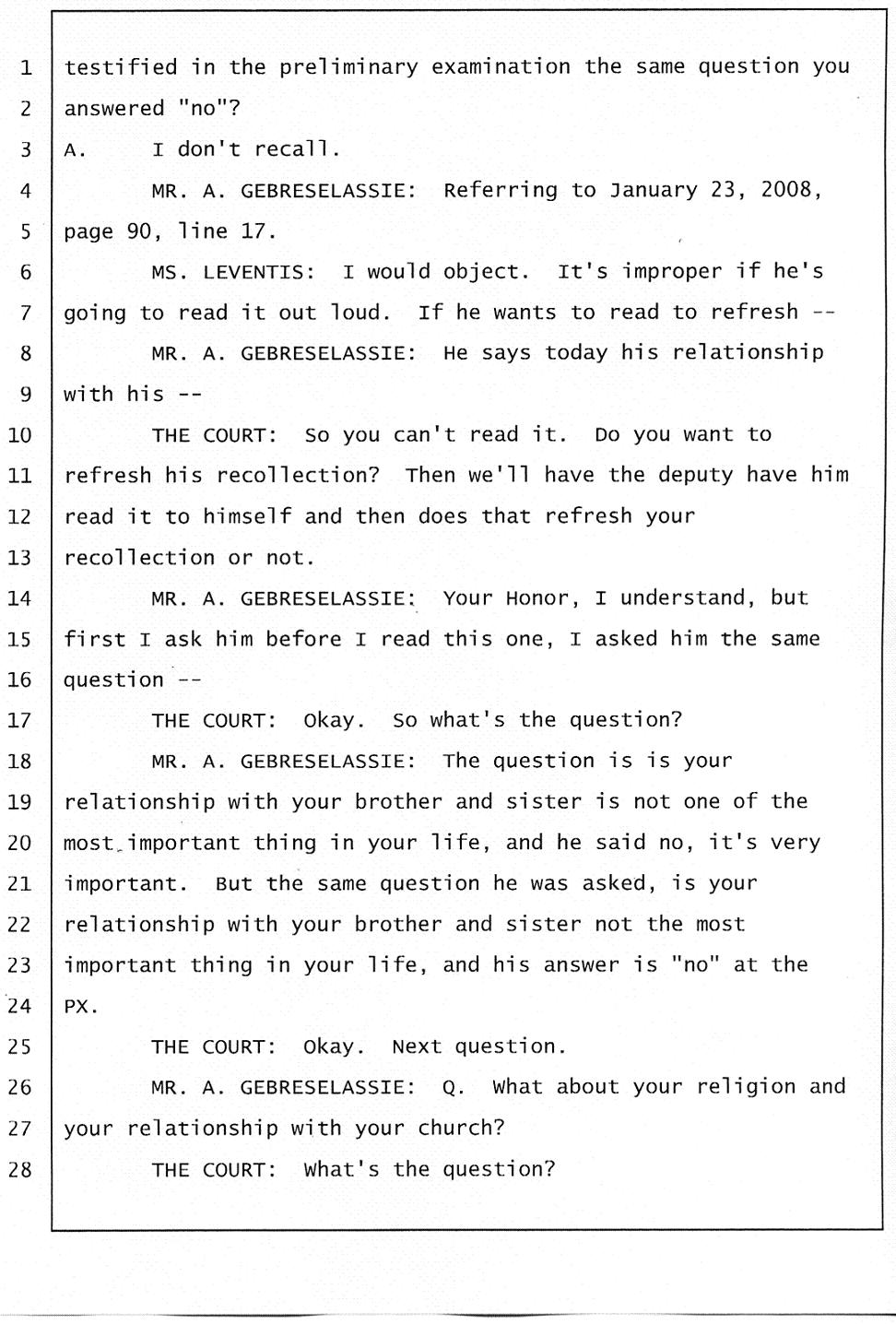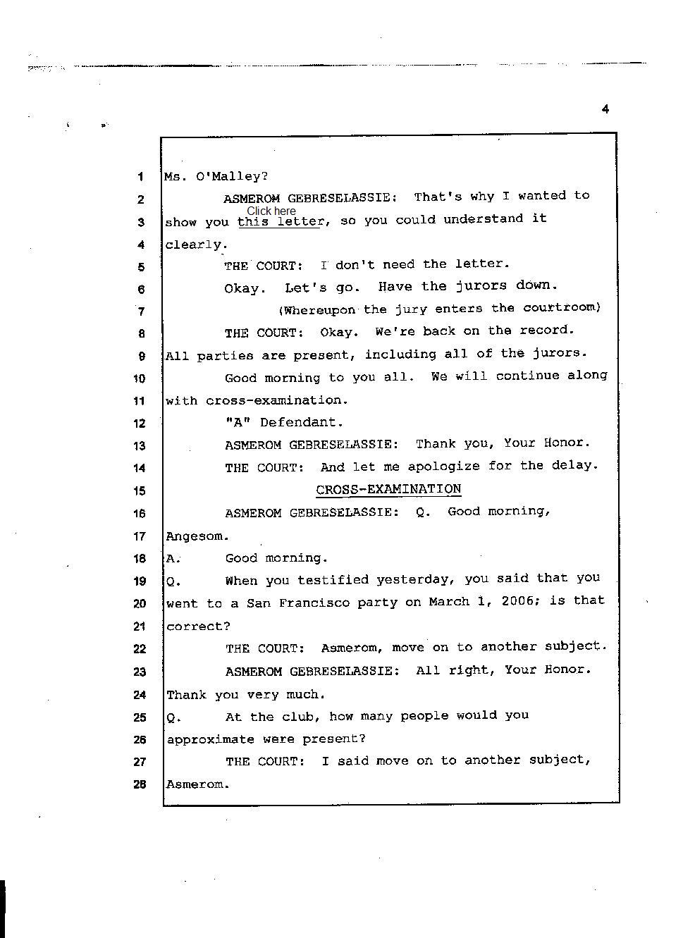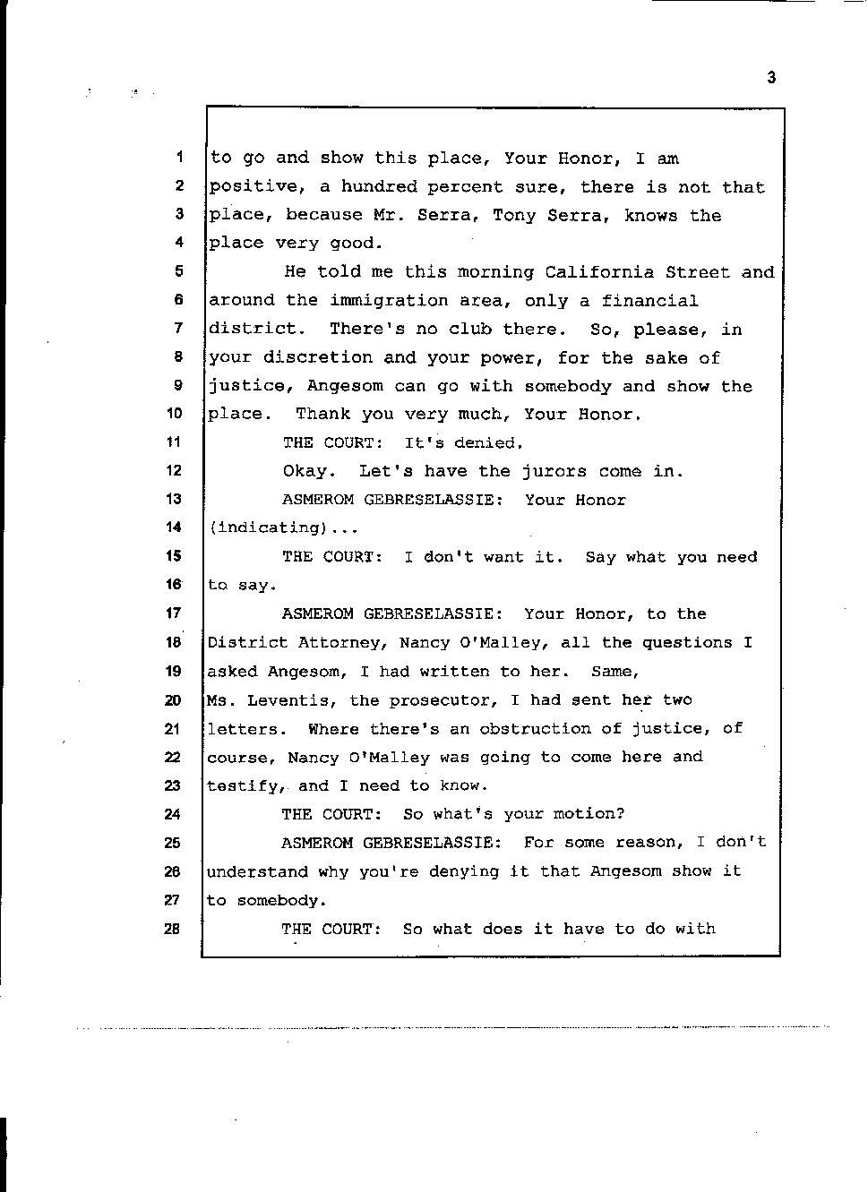 Initially Angesom and his family claimed Angesom was at work in the early morning of March 1, 2006 to cover up the fact that he was at Abraham’s house participating in Abraham’s murder. During the preliminary hearing, however, Angesom changed his story and he deliberately lied on the witness stand while he was under oath, saying that he was at a bar in San Francisco at the time of Abraham’s death. He changed his account because he knew investigators would find out that he was not at work. During the trial, he came up with a different story and he deliberately testified falsely under oath that he was at a club that played hip-hop music, drinking beer and partying there. Furthermore, he testified that he had been to that particular club over 100 times in the past. He said the club was located on California street around the Immigration office. Click here.