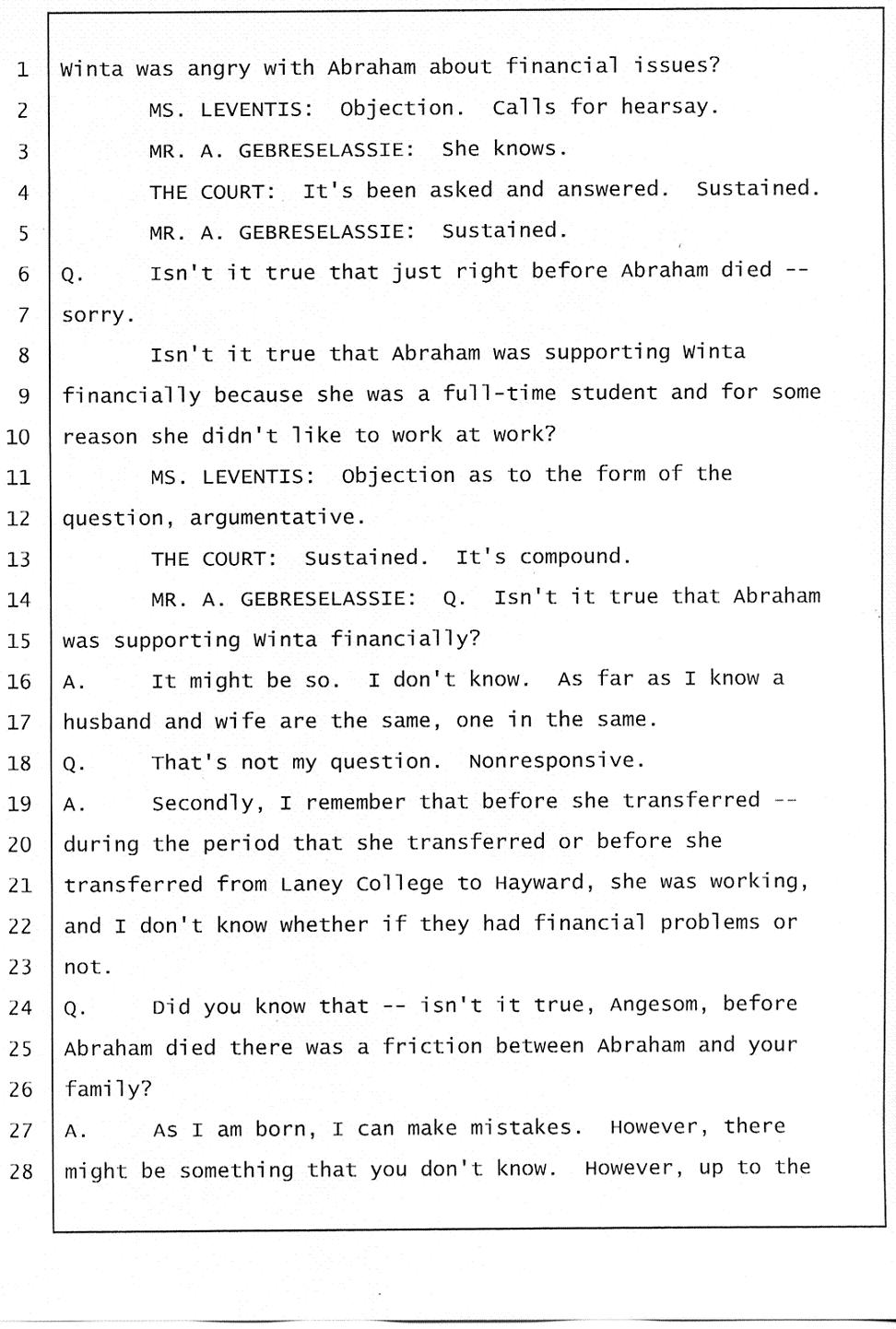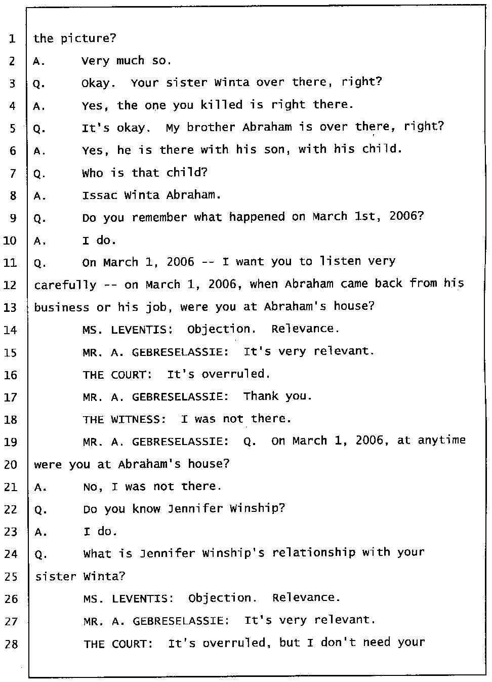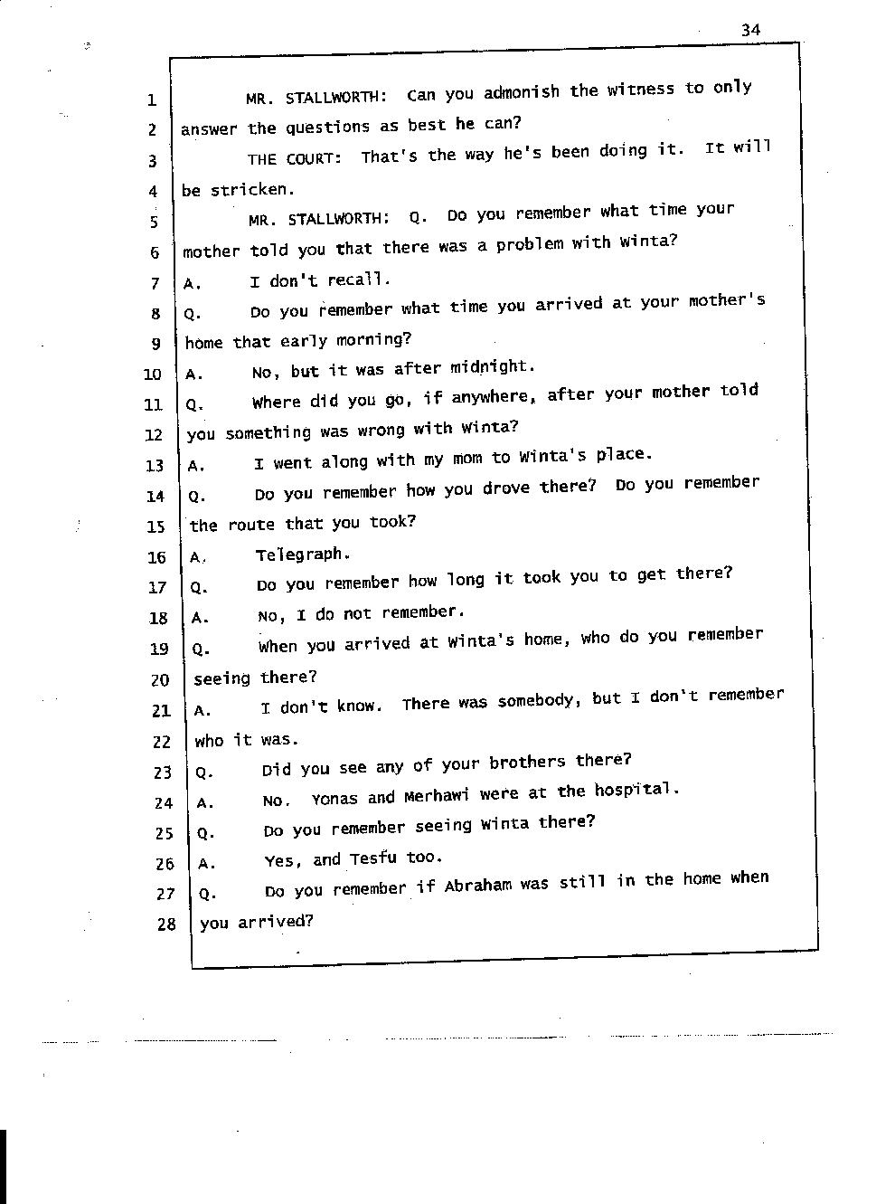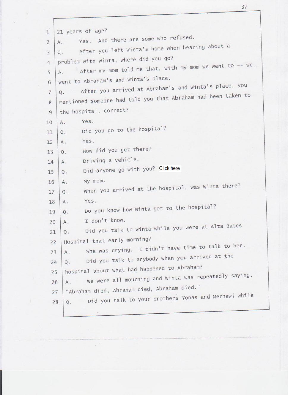 According to Mr. Gtsadek's testimony the word "Gelagliw" comes from the third person. So it is obvious that at least one of Winta’s brothers was there with her. And I know for sure the voice is either Merhawi or Angesom’s voice. But why did Winta lie to the investigators by saying no one was at her house except Abraham and Isaac when she made 911 call? She lied because she had something to hide. She lied to hide the fact that she and her brothers murdered Abraham. Click here.