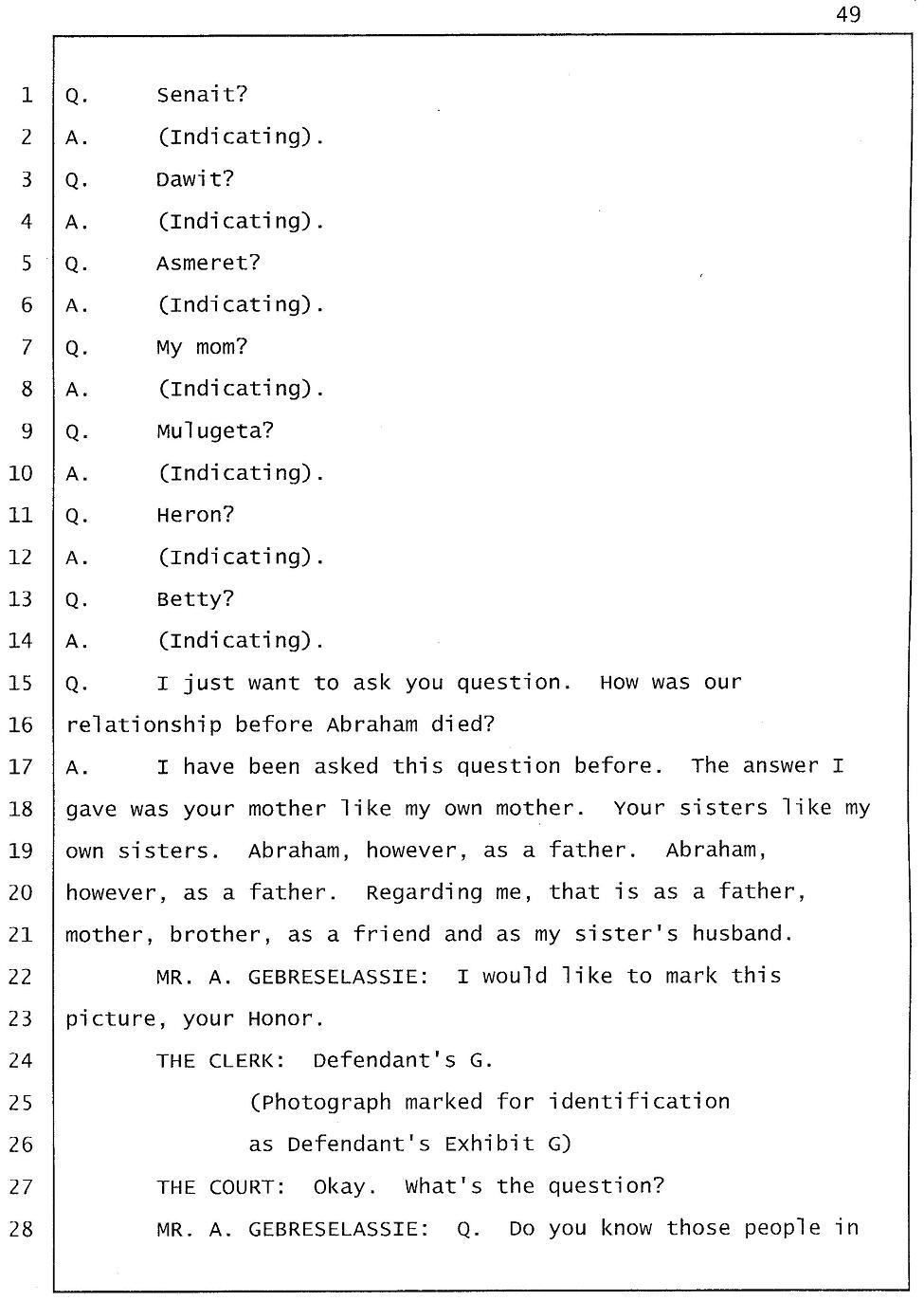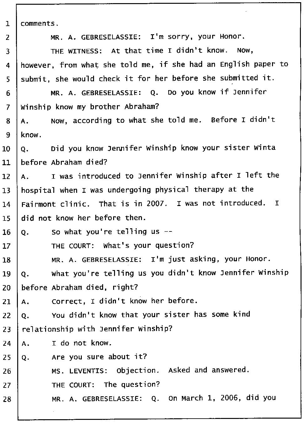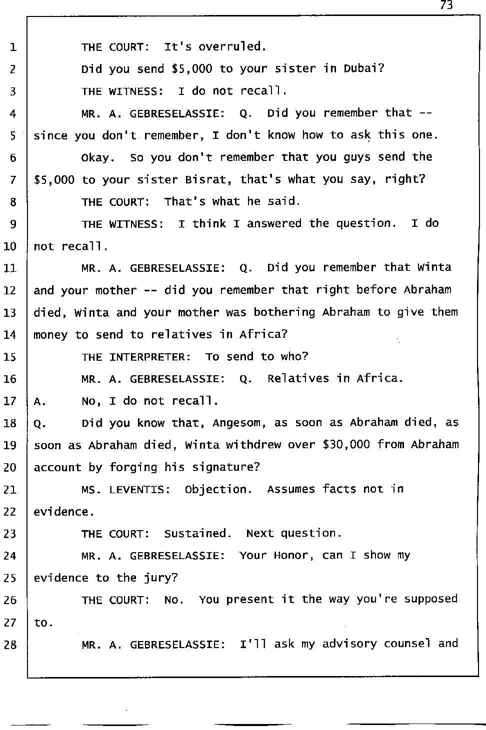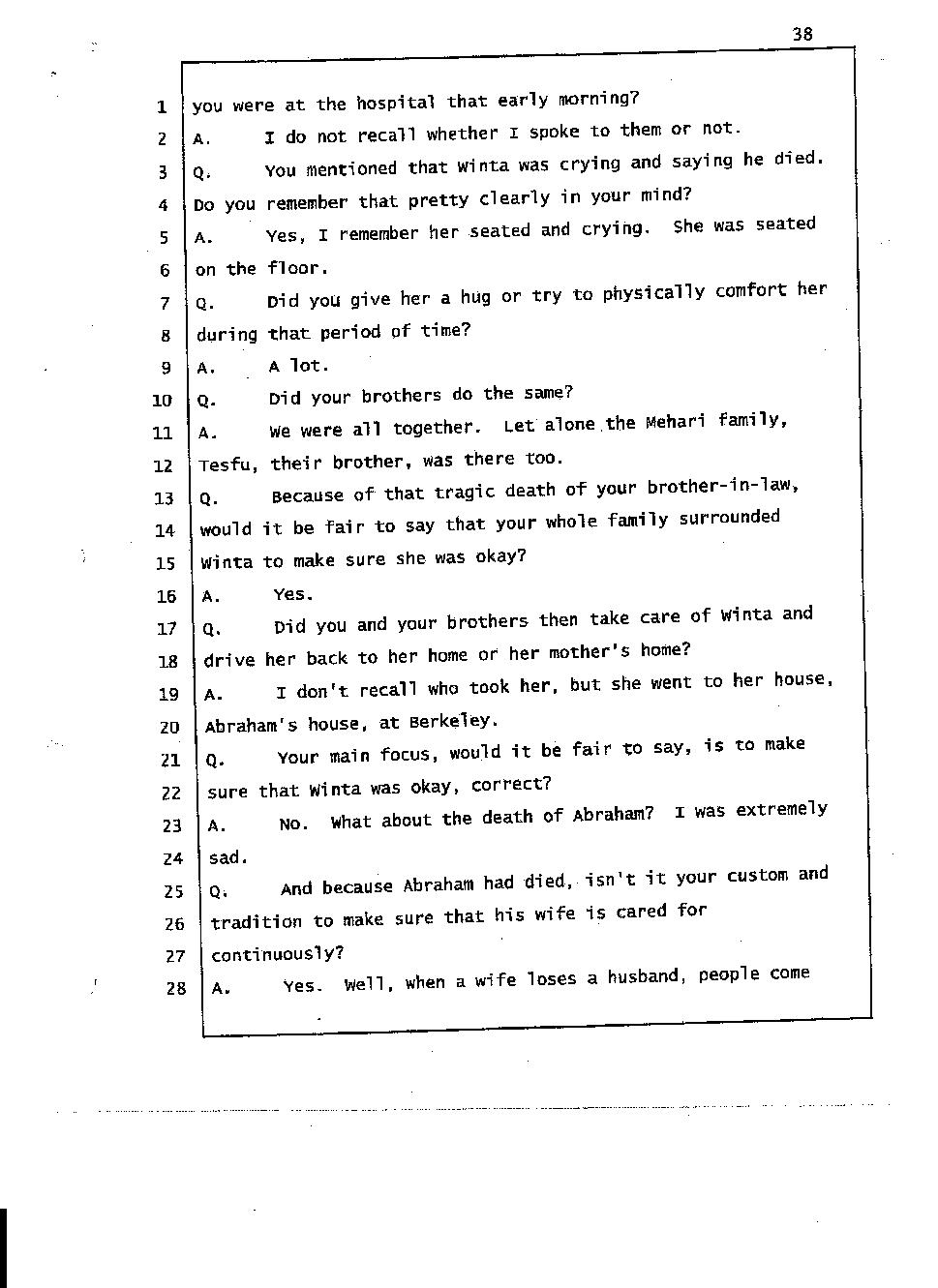 According to Mr. Gtsadek's testimony the word "Gelagliw" comes from the third person. So it is obvious that at least one of Winta’s brothers was there with her. And I know for sure the voice is either Merhawi or Angesom’s voice. But why did Winta lie to the investigators by saying no one was at her house except Abraham and Isaac when she made 911 call? She lied because she had something to hide. She lied to hide the fact that she and her brothers murdered Abraham. Click here.