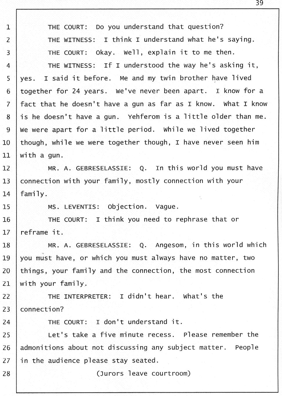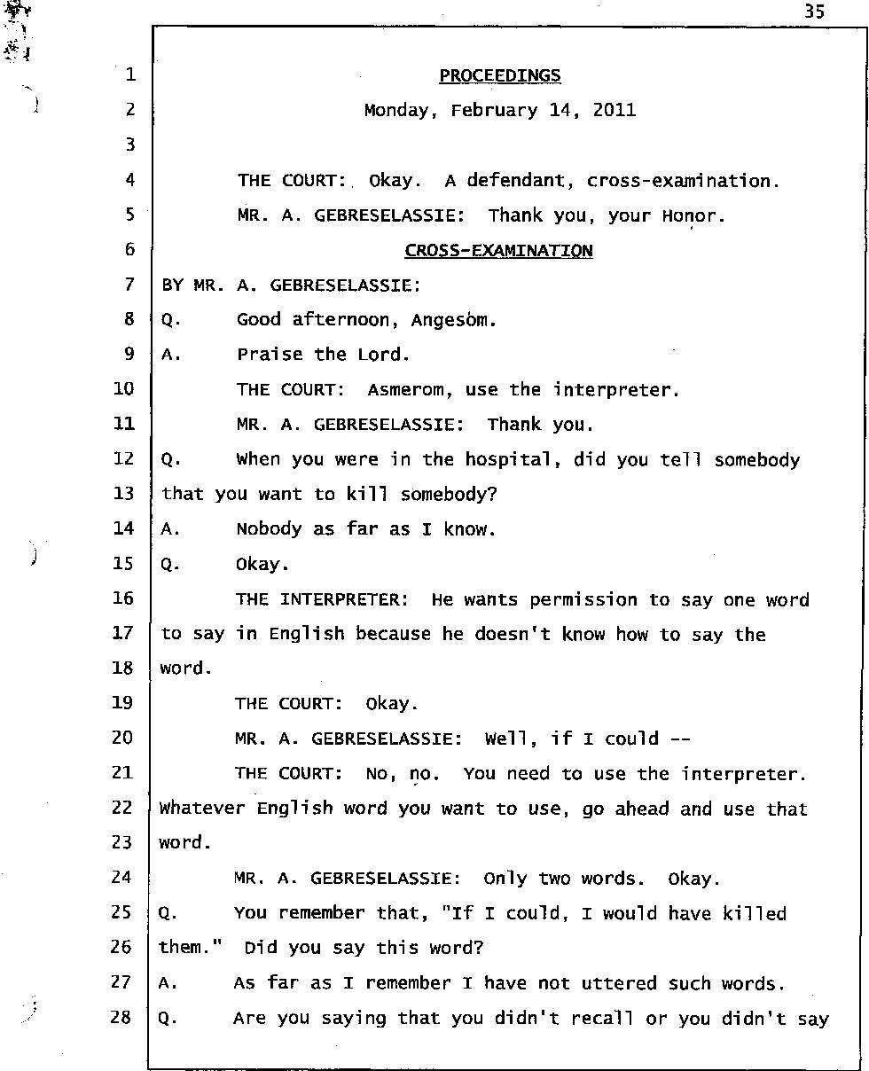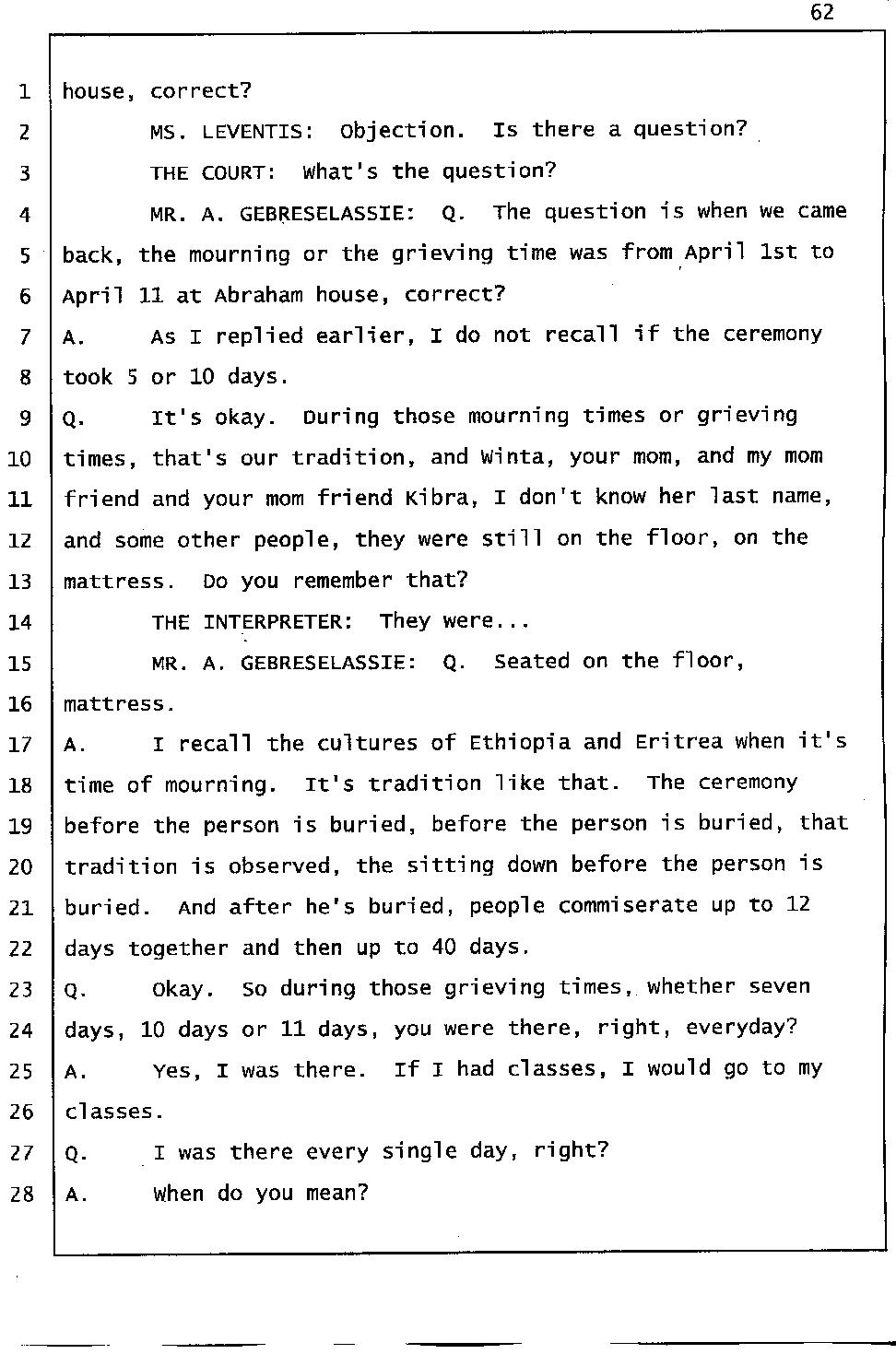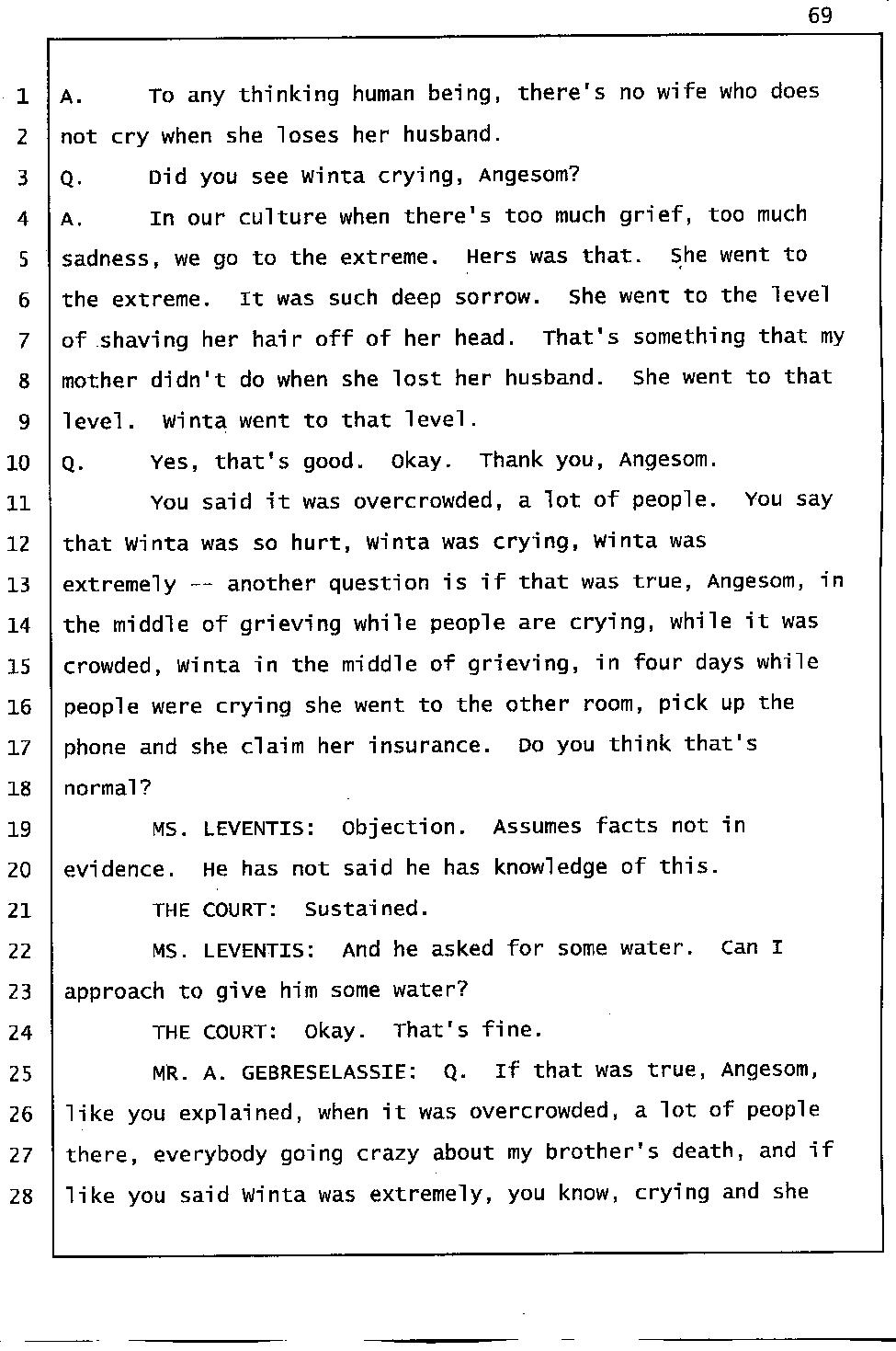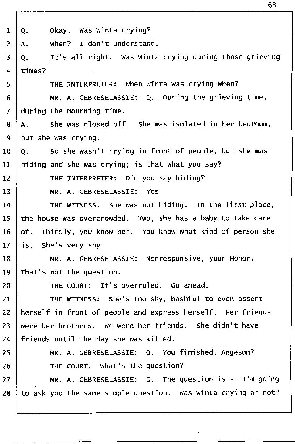 Still of great concern is the meaning of "Gelagliw" and what it indicates about how events unfolded the night Abraham died. Mr. Gtsadek confirmed that "Gelagliw" means to separate people who are fighting, to relieve someone who is in distress; that is to commit a mercy killing, or to finish someone off. During the trial, the prosecutor acknowledged that someone whispered "Gelagliw" to Winta during her 911 call. She further conceded that Winta Killed Abraham because he was in distress and suffering.