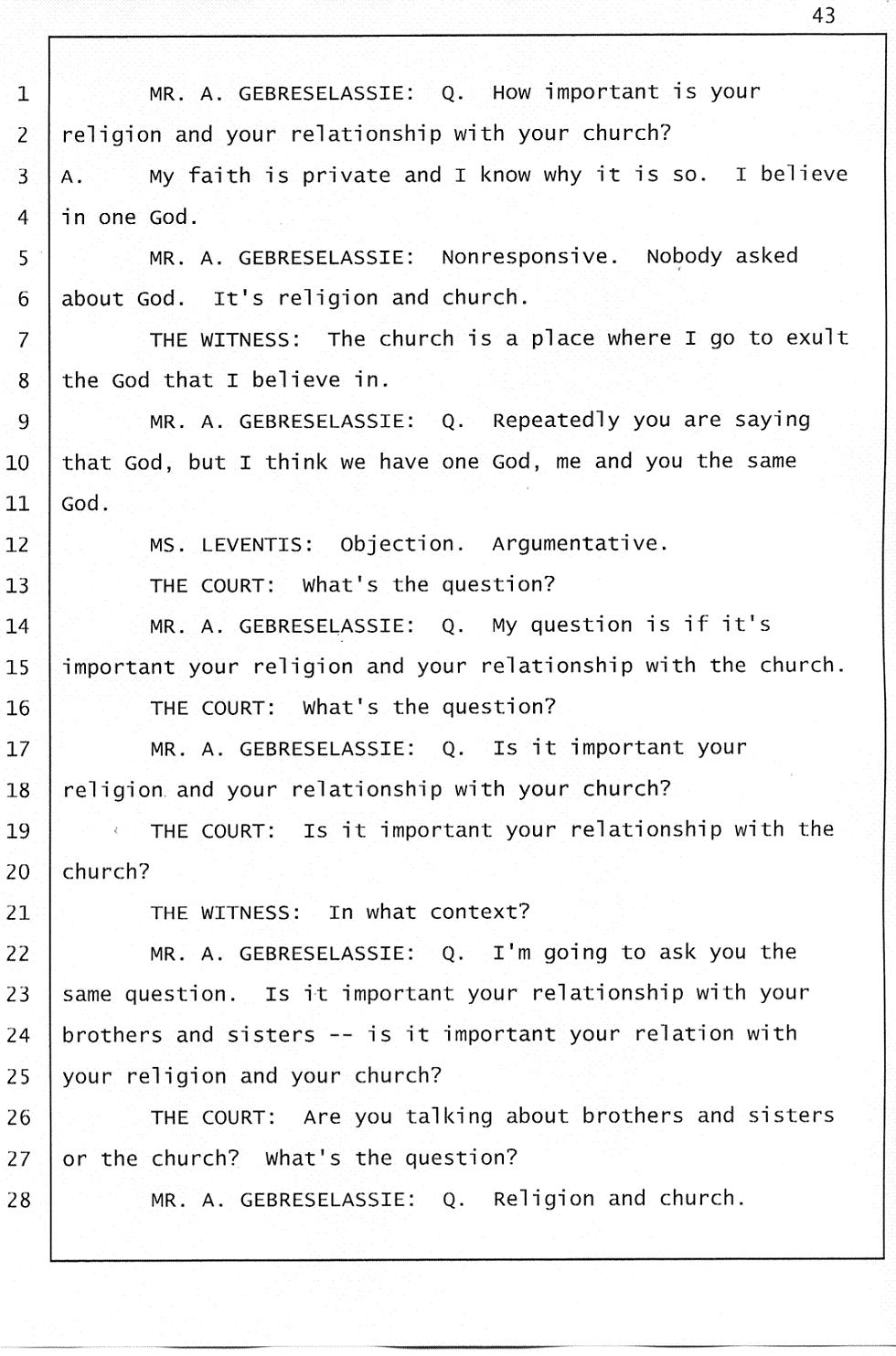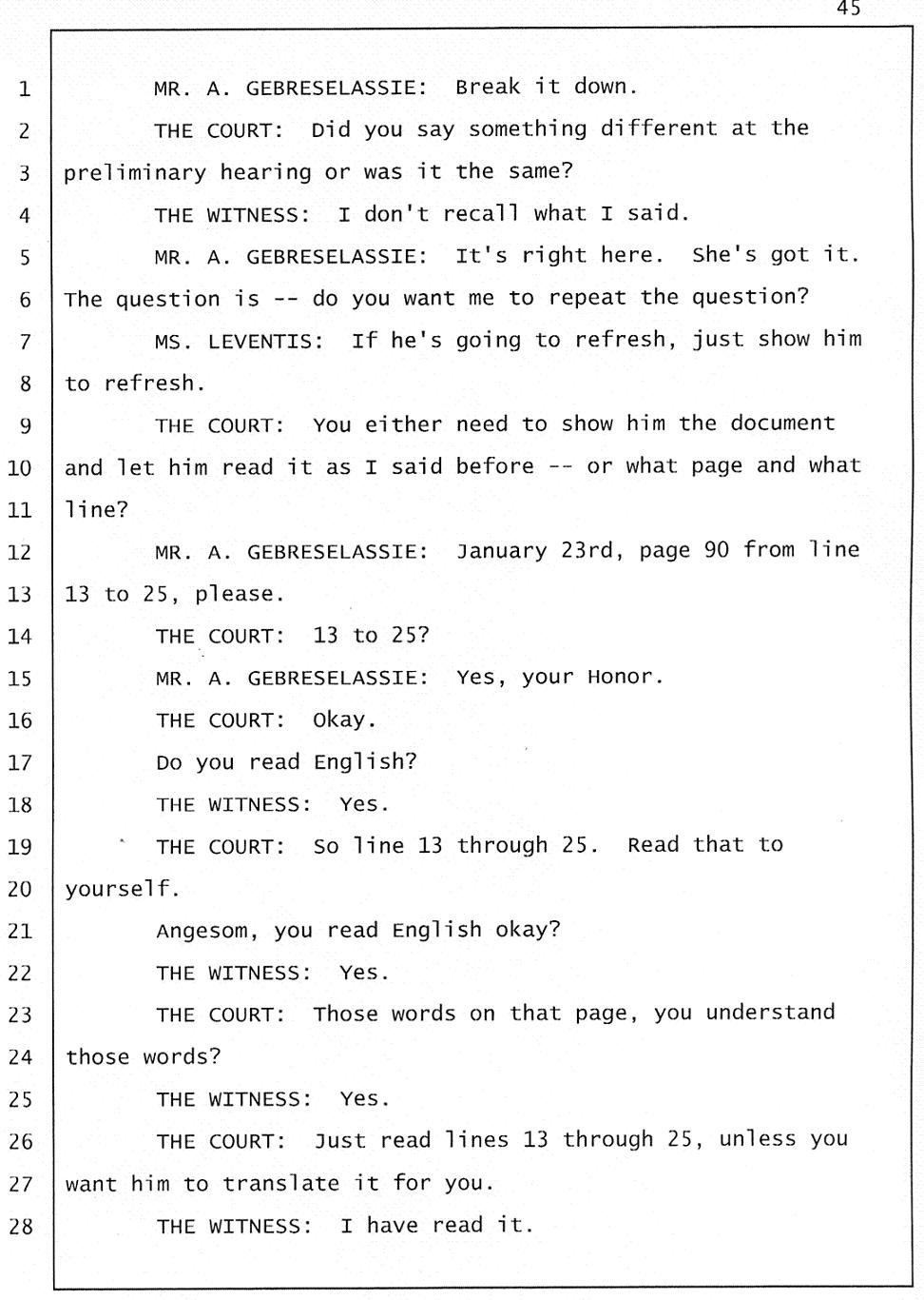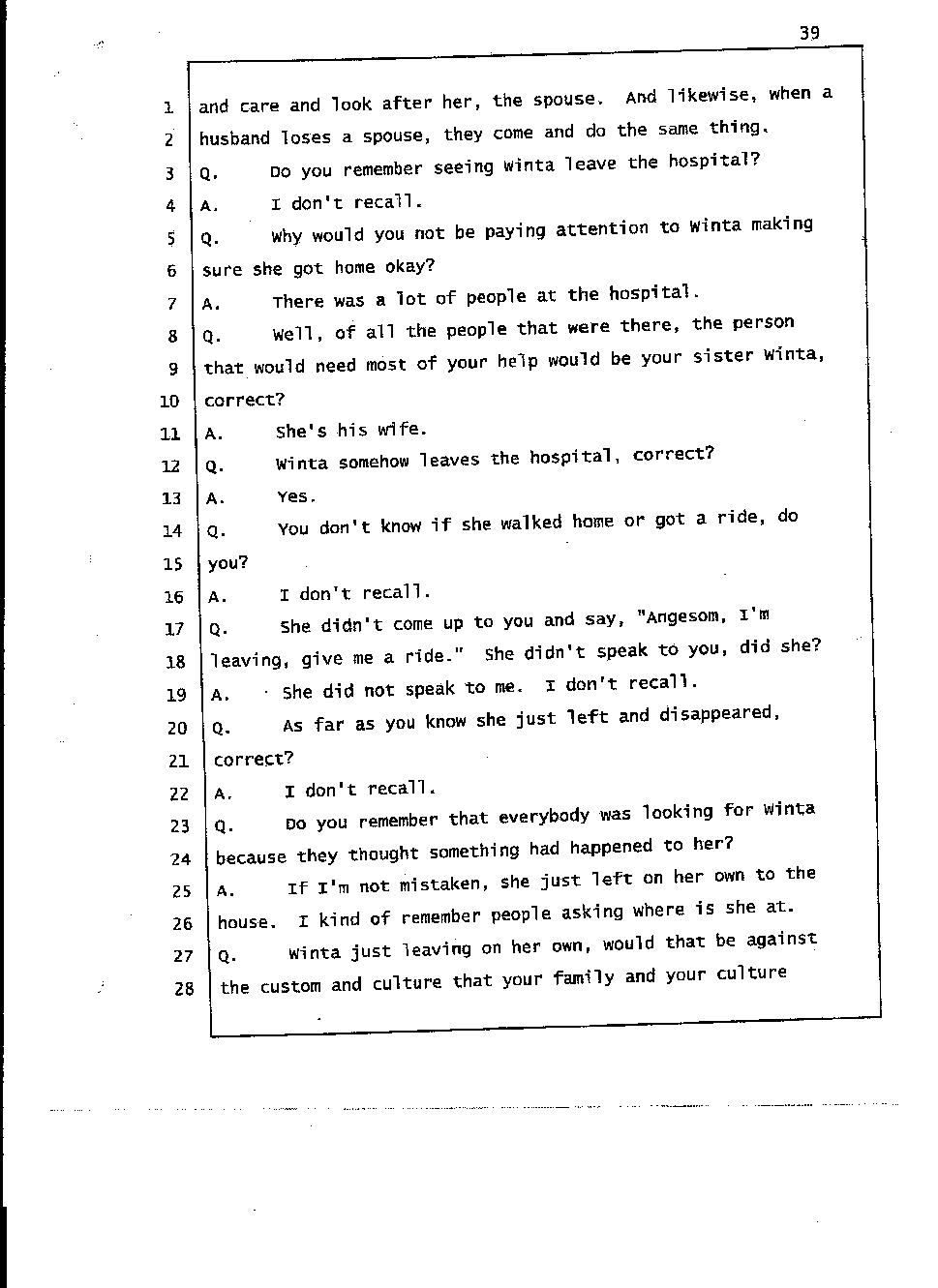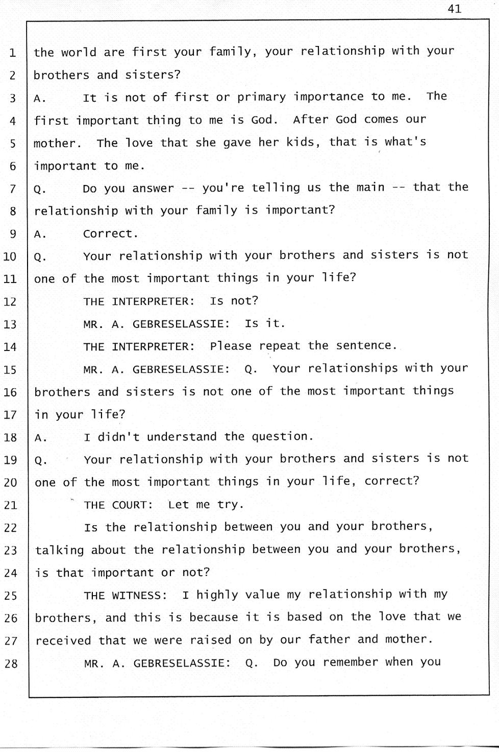 Still of great concern is the meaning of "Gelagliw" and what it indicates about how events unfolded the night Abraham died. Mr. Gtsadek confirmed that "Gelagliw" means to separate people who are fighting, to relieve someone who is in distress; that is to commit a mercy killing, or to finish someone off. During the trial, the prosecutor acknowledged that someone whispered "Gelagliw" to Winta during her 911 call. She further conceded that Winta Killed Abraham because he was in distress and suffering.