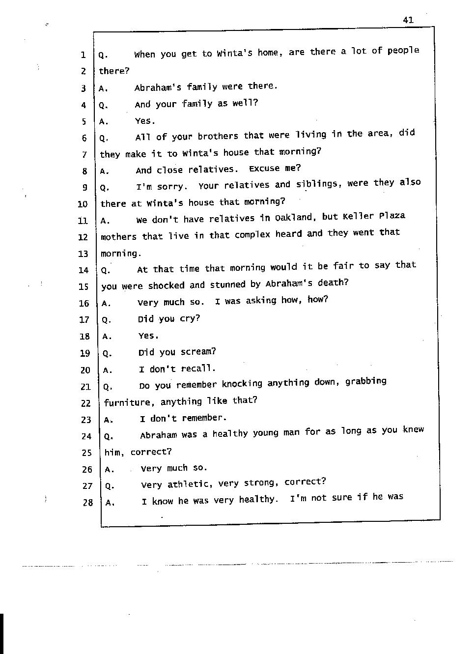 Abraham was in excellent physical shape up to the day he died. He was strong, vigorous, fit and healthy. Indeed Dr. Rogers who was in charge of Abraham’s autopsy stated that all of Abraham’s vital organs were healthy and did not contribute to his death. And he classified Abraham’s death as undetermined. Clearly Winta was not performing a mercy killing on a long-suffering husband or comatose spouse. So what the prosecutor conceded Winta did was an act of homicide, not an act of mercy killing. Even if it had been a mercy killing, it would have been homicide because mercy killing or enthanasia is illegal in California. It is murder, pure and simple. This is clear evidence that Winta murdered Abraham with the aid of her brothers.