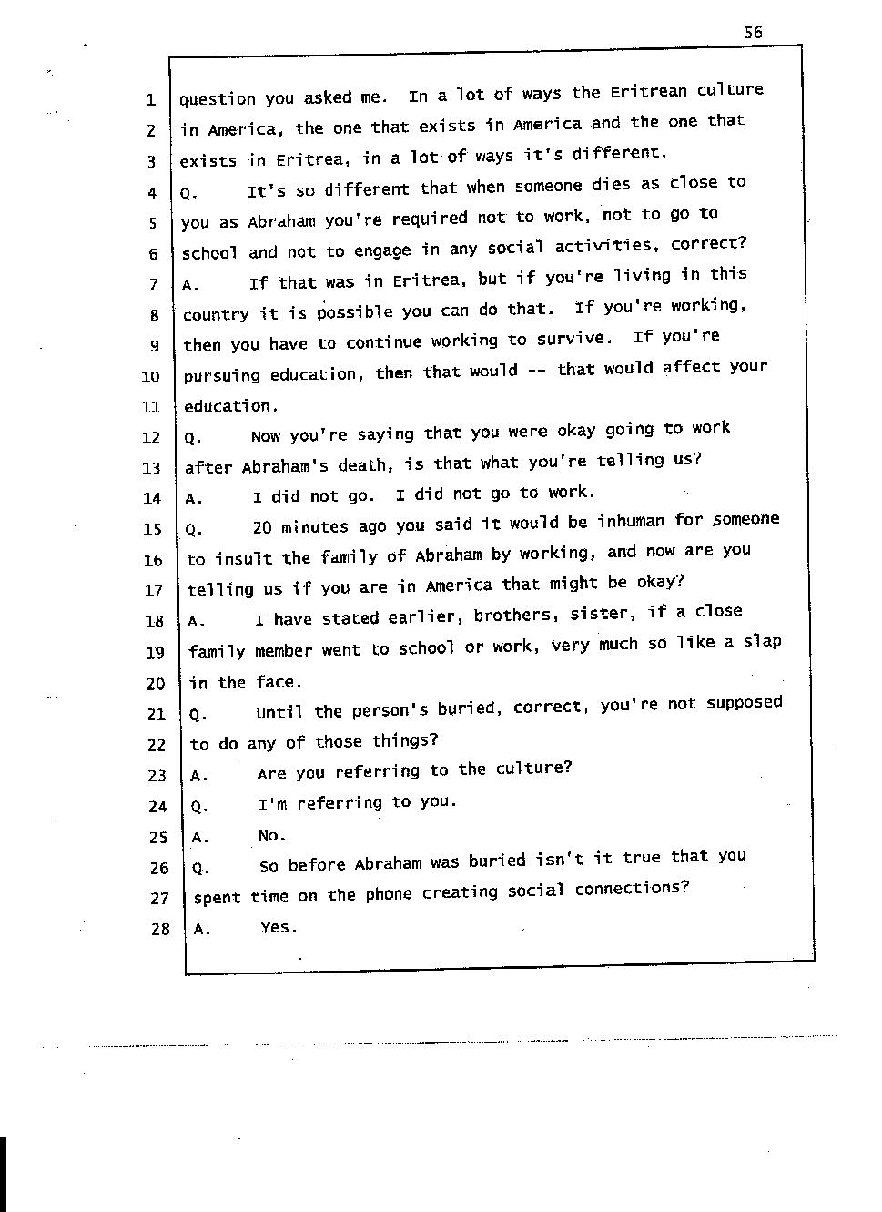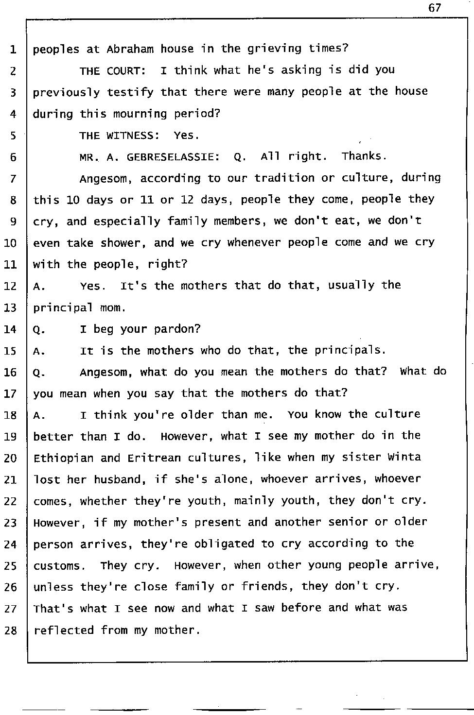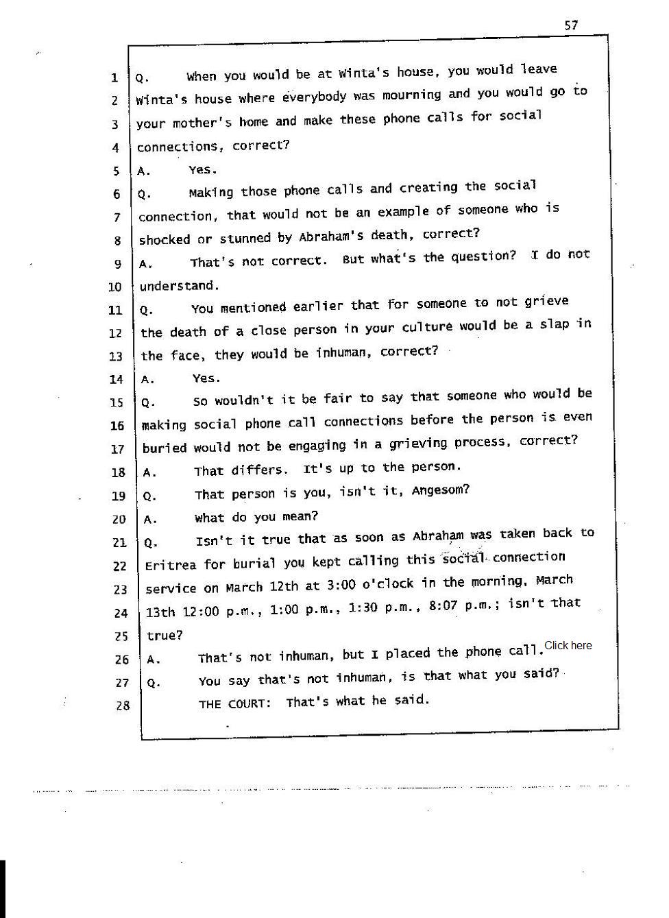 During the trial, the Mehari brothers' testimony about Abraham’s death indicate that they had a hand in Abraham’s death. For instance, Angesom testified that for someone not to grieve the death of a close person in our culture would be a slap in the face, that person must be inhuman. Well his own words prove that he is inhuman because he was repeatedly calling Interactive Male Service and he was having fun before Abraham’s body was laid to rest. He was not grieving because he and his family murdered Abraham and Abraham’s death meant nothing to him. Click here 1, 2.