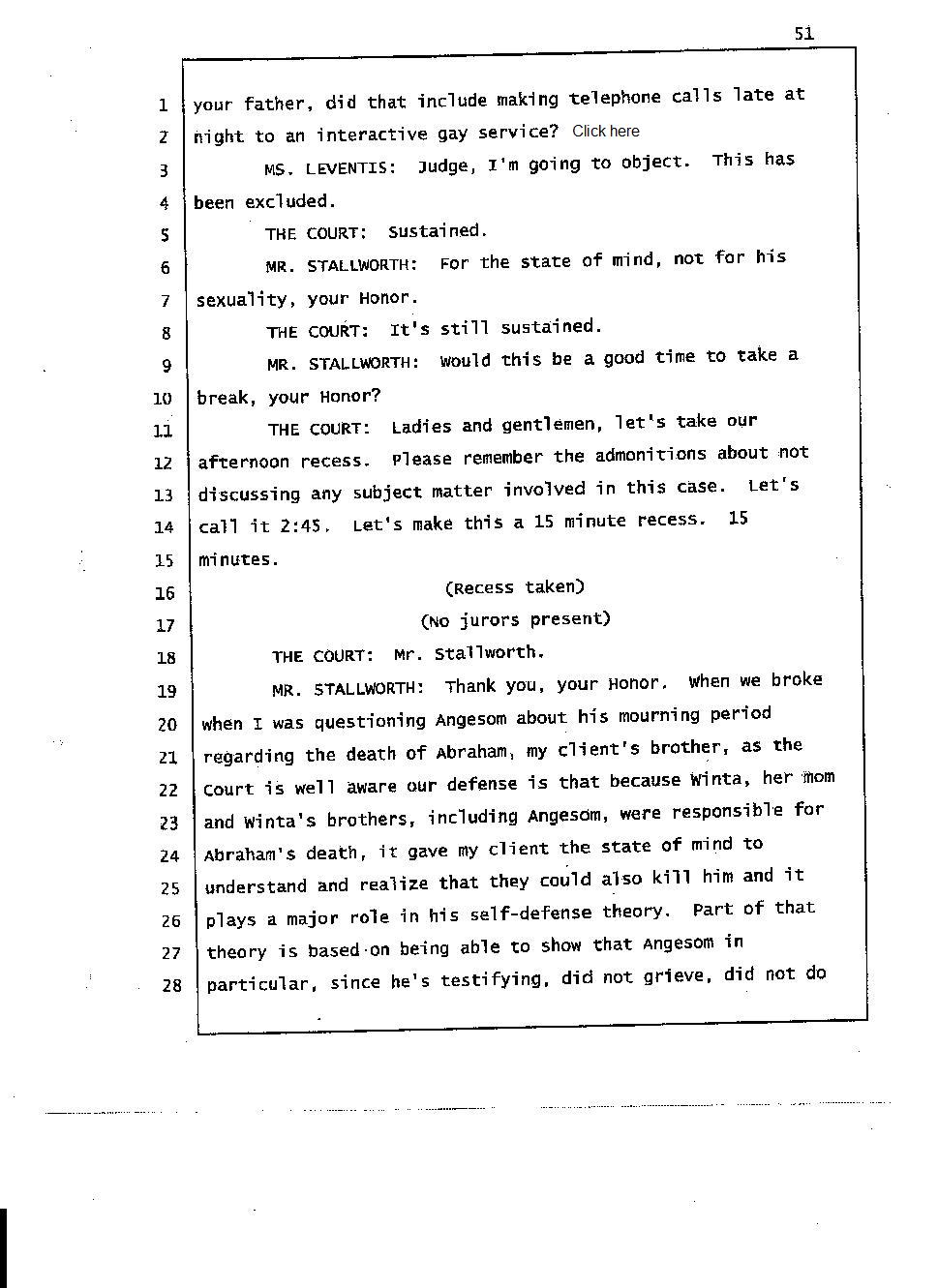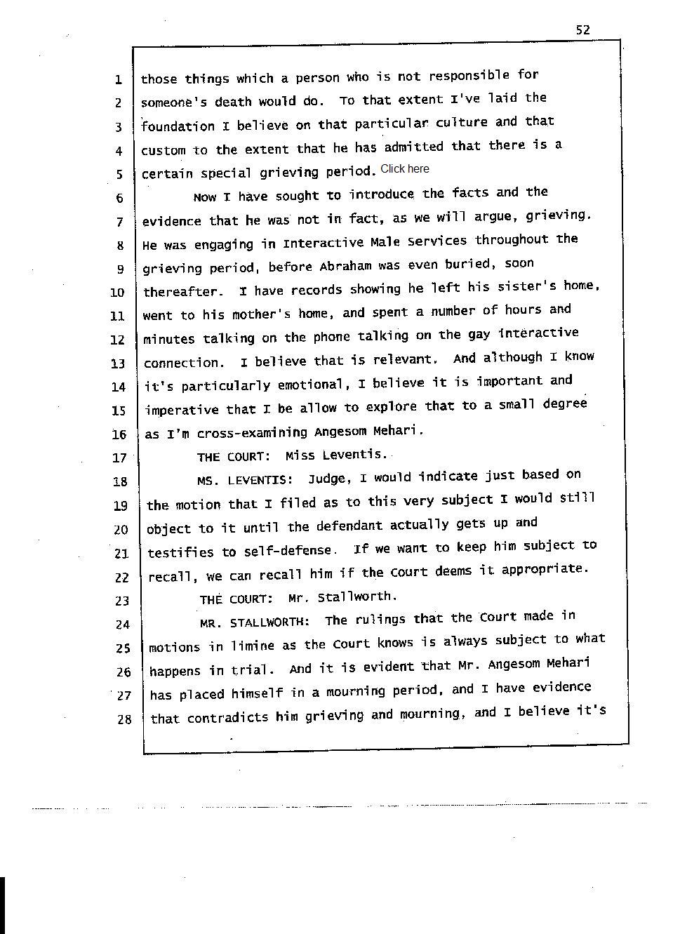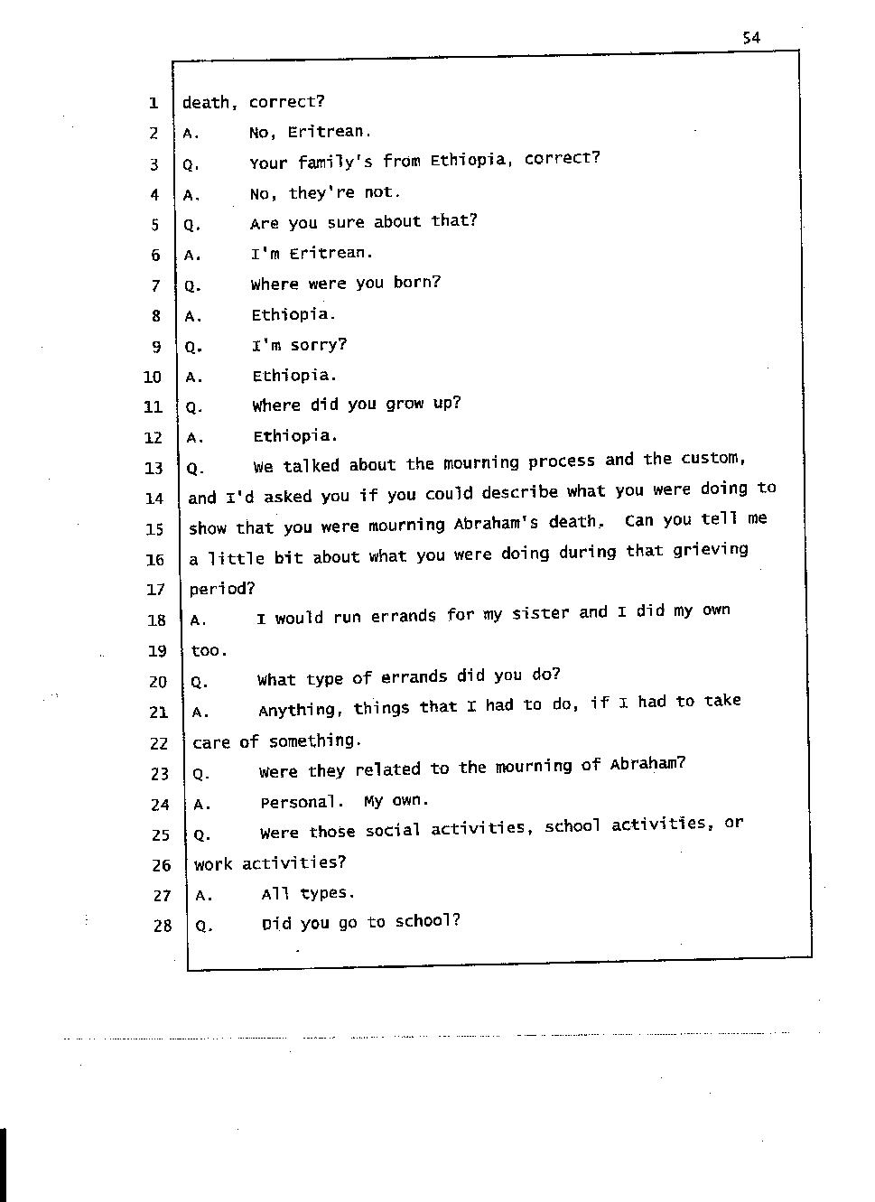 During the trial, the Mehari brothers' testimony about Abraham’s death indicate that they had a hand in Abraham’s death. For instance, Angesom testified that for someone not to grieve the death of a close person in our culture would be a slap in the face, that person must be inhuman. Well his own words prove that he is inhuman because he was repeatedly calling Interactive Male Service and he was having fun before Abraham’s body was laid to rest. He was not grieving because he and his family murdered Abraham and Abraham’s death meant nothing to him. Click here 1, 2.