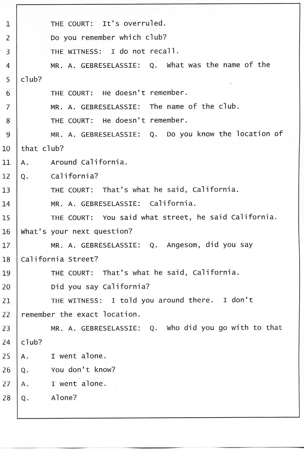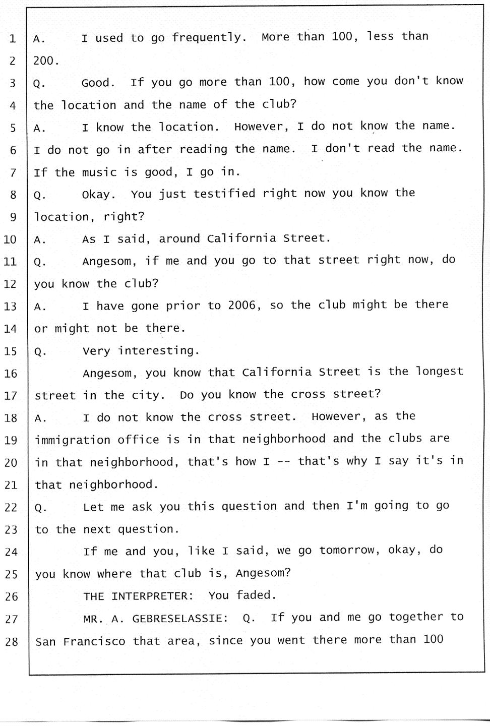 If Angesom had been to that club as often as he claimed, then he should know where it is located. The truth is, there was no club on California street around the Immigration office on March 1, 2006, and there is no club at all on that location right now. Click here. Thus, it’s obvious that Angesom was not at a nightclub on California street as he stated under oath. So he committed perjury when he deliberately testified falsely under oath that he was at a nightclub on California street at the time of Abraham’s death.