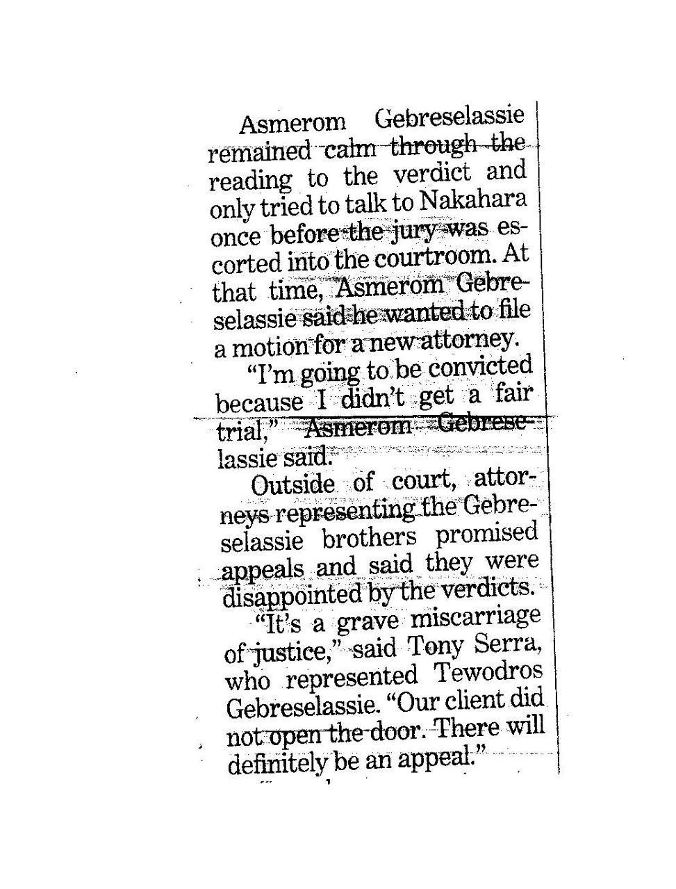 All I know is, the conviction is a wrongful conviction because the verdict is contrary to the evidence. Let the evidence speak for itself. The evidence clearly shows that my brother did not open the door for me, and also shows that the Mehari brothers (the criminals) deliberately lied about what occurred in their apartment in order to conceal their crime. Click here