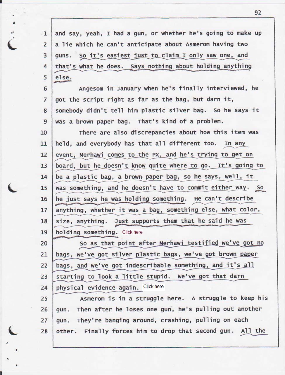 Yehferom was the only person who stated that I spoke of Abraham, and he was the only person who also stated that I had two guns, and he described them inconsistently in his two police statements and testimony. In his written statement, he told the police that I came into the apartment holding two guns in my hands Click here. In his taped statement, he initially told the investigators the same thing he told the police in his written statement which is that I came into the apartment holding two guns in my hands. But later on when the investigators asked him whether I fired one gun or both guns, he had to come up with some explanation about why I only fired one gun if I had two guns in my hands. So he came up with plastic bag story and told them that one of the guns was in a silver plastic bag. Click here. During the preliminary hearing, he changed his story about the guns, saying that I had one gun in my hand and the second gun in my waistband. He changed his story because he knew I didn’t have a bag in my hand and he also knew that the story he told the investigators about the guns didn’t make sense at all Click here. His various contradictory statements for placing his gun in my possession show consciousness of guilt.