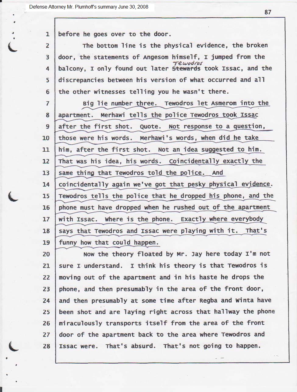 During the preliminary hearing Angesom, Merhawi, and Yehferom deliberately lied about what occurred in their apartment to hide their crime. Knowing that Regbe was the one who opened the door for me and Tewodros was inside the living room sitting on a chair when I entered their apartment, they testified that Tewodros opened the door for me and left with Isaac before I entered their Apartment. They also testified that Tewodros was talking on his cell phone while he was opening the door for me and leaving with Isaac. Click here 1 , 2 , 3.