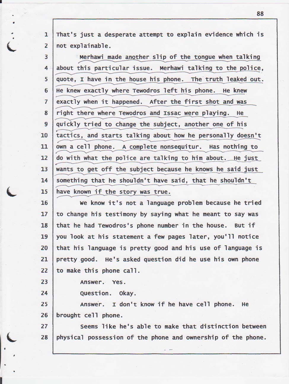 Merhawi also told the investigators that they could find Tewodros’ phone in the apartment, stating, "I have in the house his phone" when they were questioning him about whether he knew Tewodros’ cell phone number. The only way Merhawi could tell that to the investigators is if he was lying about seeing Tewodros leave the apartment with the cell phone and he knew that the cell phone was on the living room rug near the chair where Tewodros was sitting and playing with Isaac.Click here.
