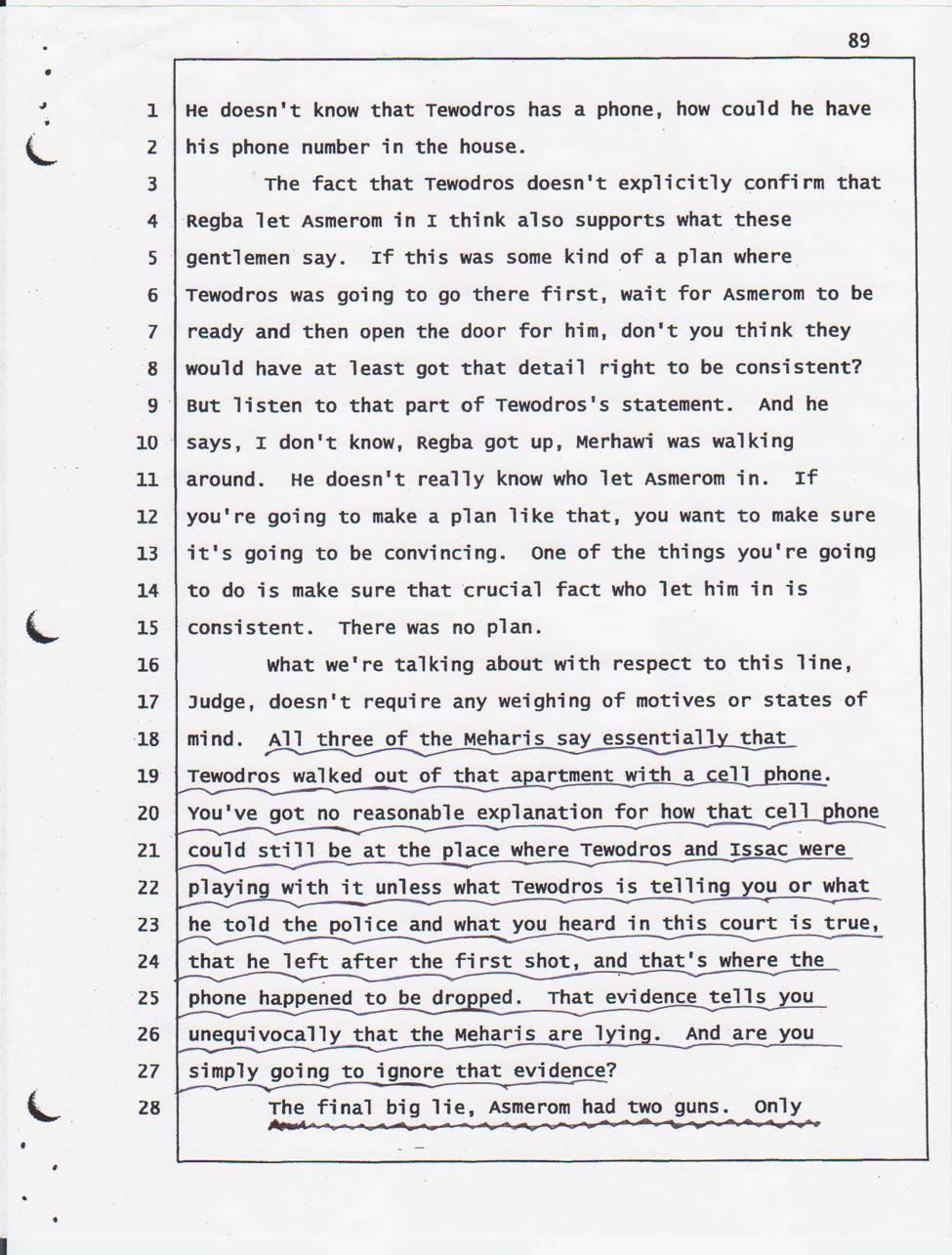 Based on Angesom, Merhawi, and Yehferom’s false statements the prosecution argued in the court stating, "If there was not an illegal purpose or an illegal intent, why take Isaac before the gunshots were fired? Why take the child out of that apartment before Asmerom comes in with the gun to fulfill his intent to massacre that entire family? If Tewodros took Isaac before the shots were fired, what other purpose could there be for him to take that child?"