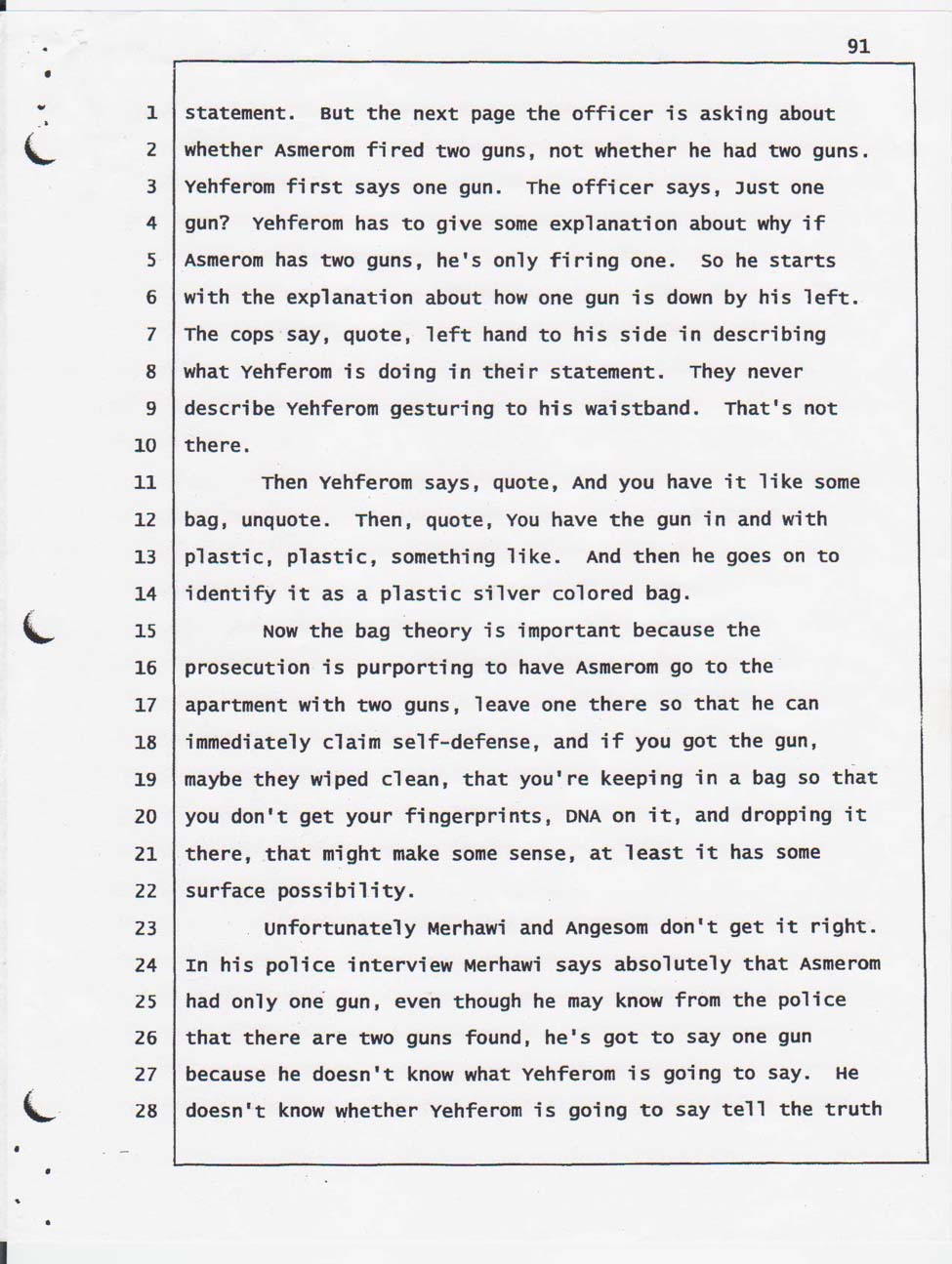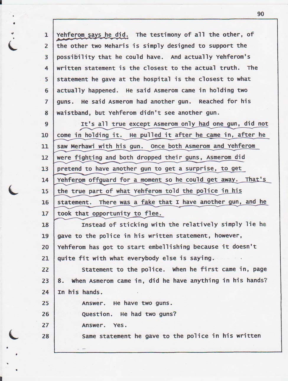 The police found two guns in the apartment. One was Yehferom’s and the other was mine. To place his gun in my possession and to make it look as if I came into their apartment to avenge my brother Abraham’s death, Yehferom lied to the police and told them that I came into the apartment holding two guns in my hands and I said, everybody here killed Abraham, I’m going to kill you, and then I started shooting. Yehferom’s statement was deceptive and ridiculous lie because I did not have two guns and I did not speak of Abraham at all. Click here.