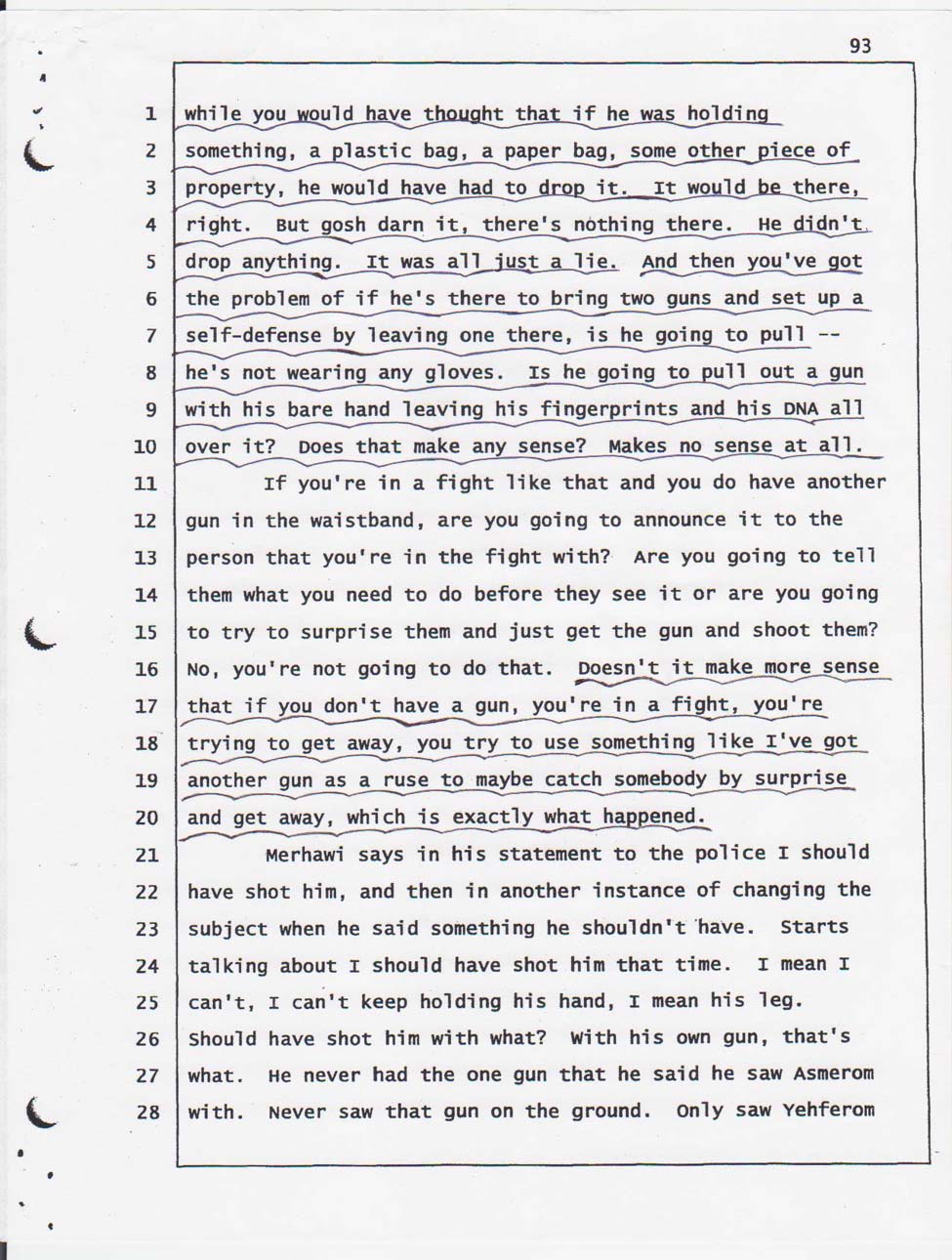 To verify Yehferom’s story, one of the investigators asked Merhawi: "How many guns total did you see? Was there one gun or two guns or three guns?" Merhawi answered "Just one gun." The investigator was expecting Merhawi to respond that he had seen two guns. When Merhawi answered he had seen just one gun, the investigator repeated Merhawi’s answer with complete surprise by asking again: "Just one gun?" To this Merhawi answered that Asmerom used the same gun, there was no second gun or third gun. Obviously If I came into the apartment holding two guns in my hands, Merhawi would have seen two guns in my hands. It’s obvious that Yehferom lied about what occurred in their apartment to hide the fact that he and his family were attempting to kill me.